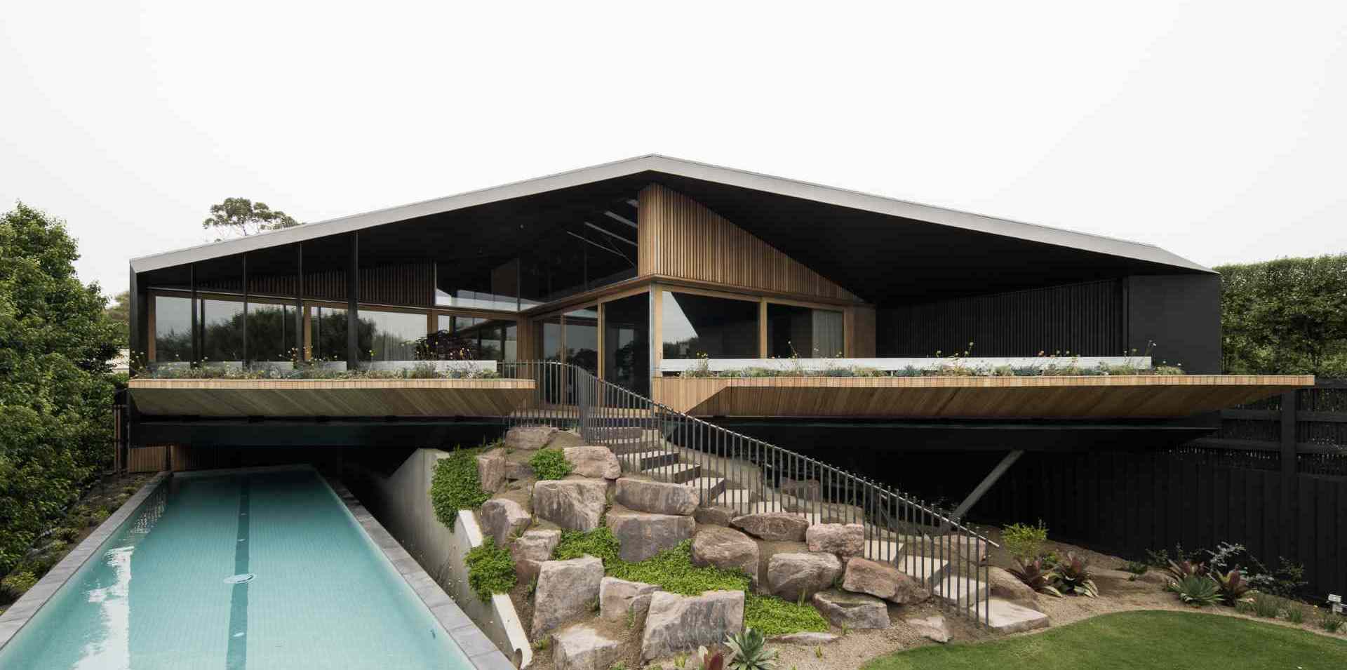 The rear facade of the home showcases a dynamic interplay of geometry and materiality. A bold, angular roofline floats above decks and cantilevered planters. Beneath the overhang, there’s a curving stairway, anchored by boulders and native plantings, seamlessly connecting the landscape to the architecture.