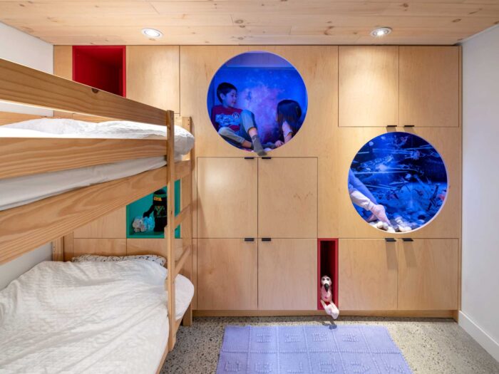 Blaine Architects together with Marshall Interiors, have completed the renovation of a mid-century modern home in San Mateo, California, for a young couple who wanted to update the kitchen, living room, dining room, and family room. Here’s a glimpse of the original kitchen and entryway… The renovated home includes a