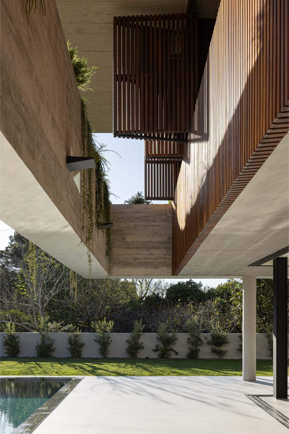 The functional organization is structured into three areas. At the entrance, a hall distributes access to the different zones. On the same level, there is a covered garage for three vehicles, a technical area, and a guest room/home office with private bathroom. The private sector includes a master suite and two smaller suites, each with bathroom, walk-in closet, bedroom, and balcony. This floor is clad with solid wood slats, unifying the volume and creating a warm, welcoming atmosphere.