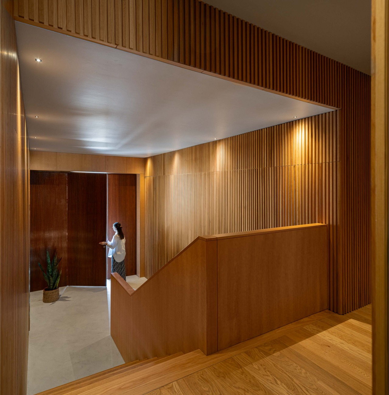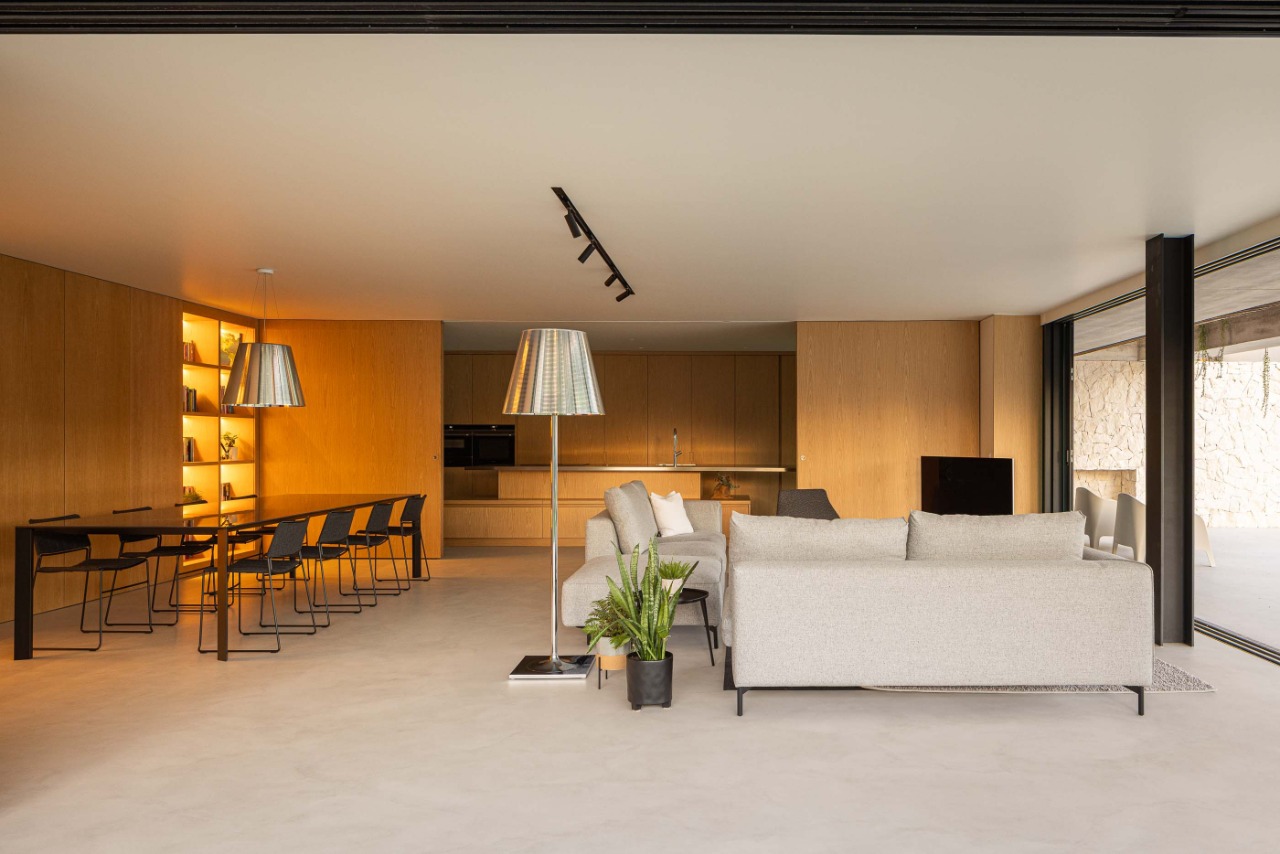 The living and dining rooms and kitchen form a continuous open space. Their subtle differentiation is achieved through uniform materialsāwood in the furniture and microcement on floorsāensuring coherence and amplitude. The transition between living and kitchen can be closed with sliding wooden panels, providing flexibility in privacy and use. The kitchen incorporates a concealed panel system that hides functional elements when closed, reinforcing its multifunctional nature.