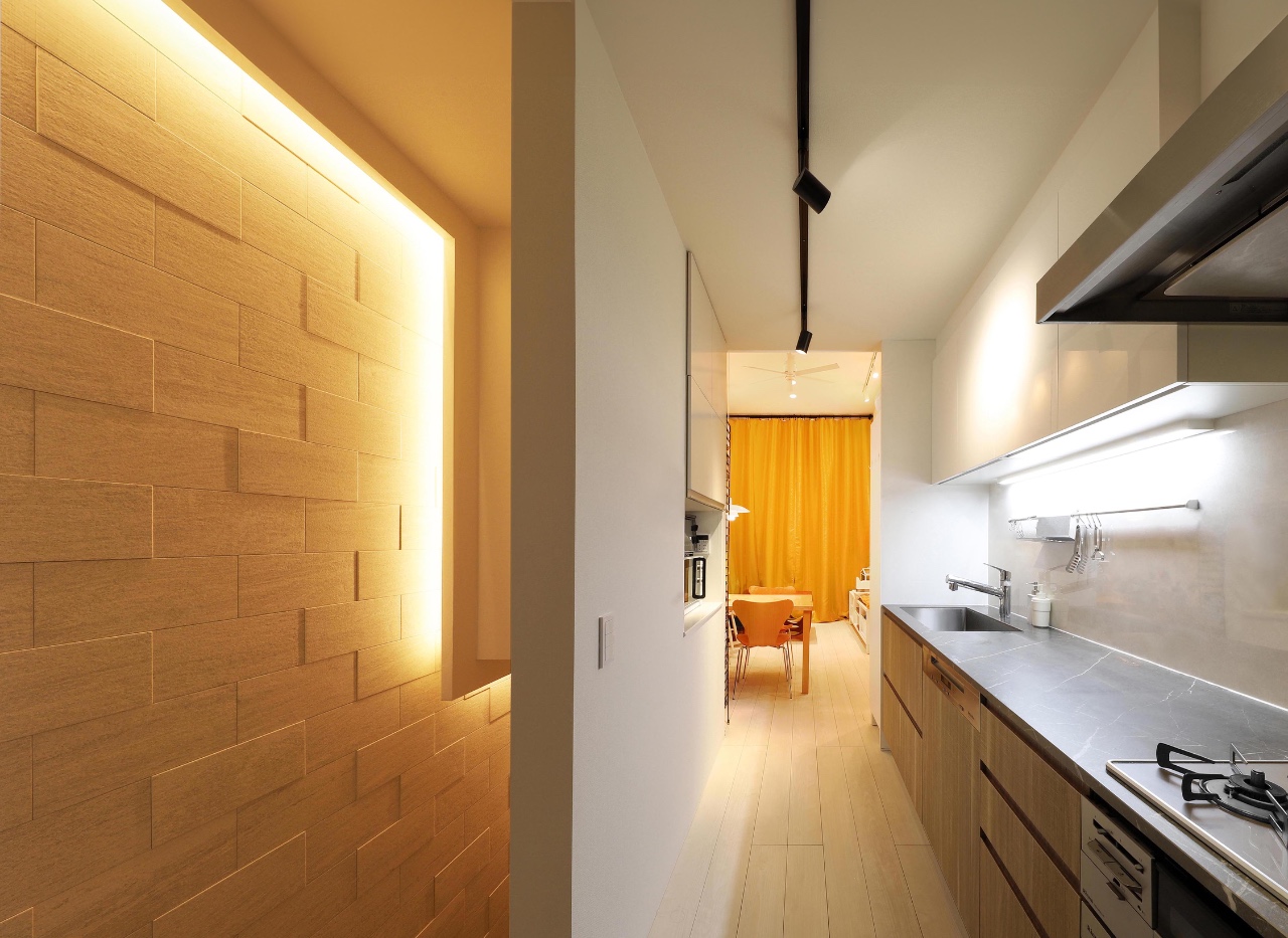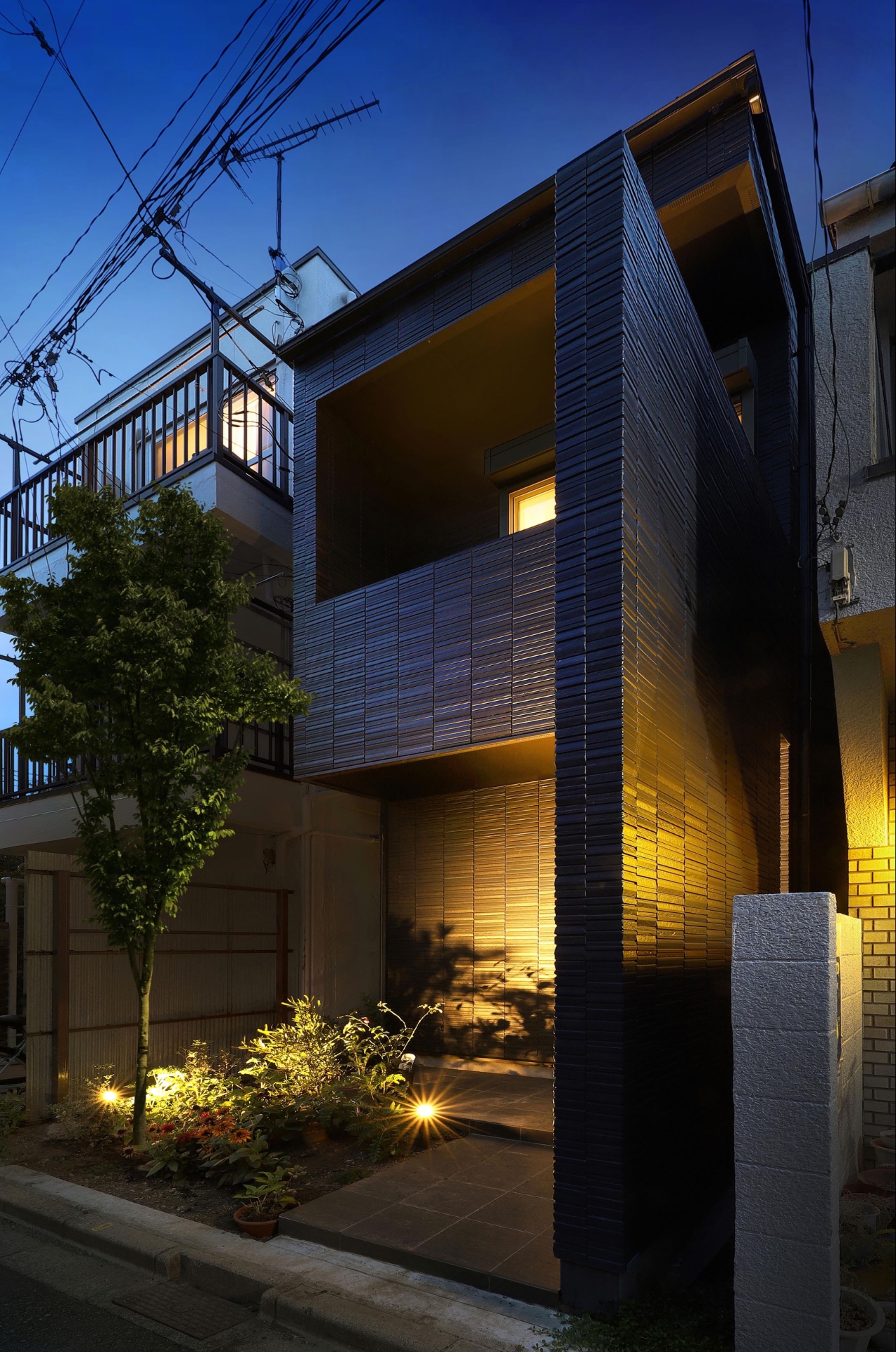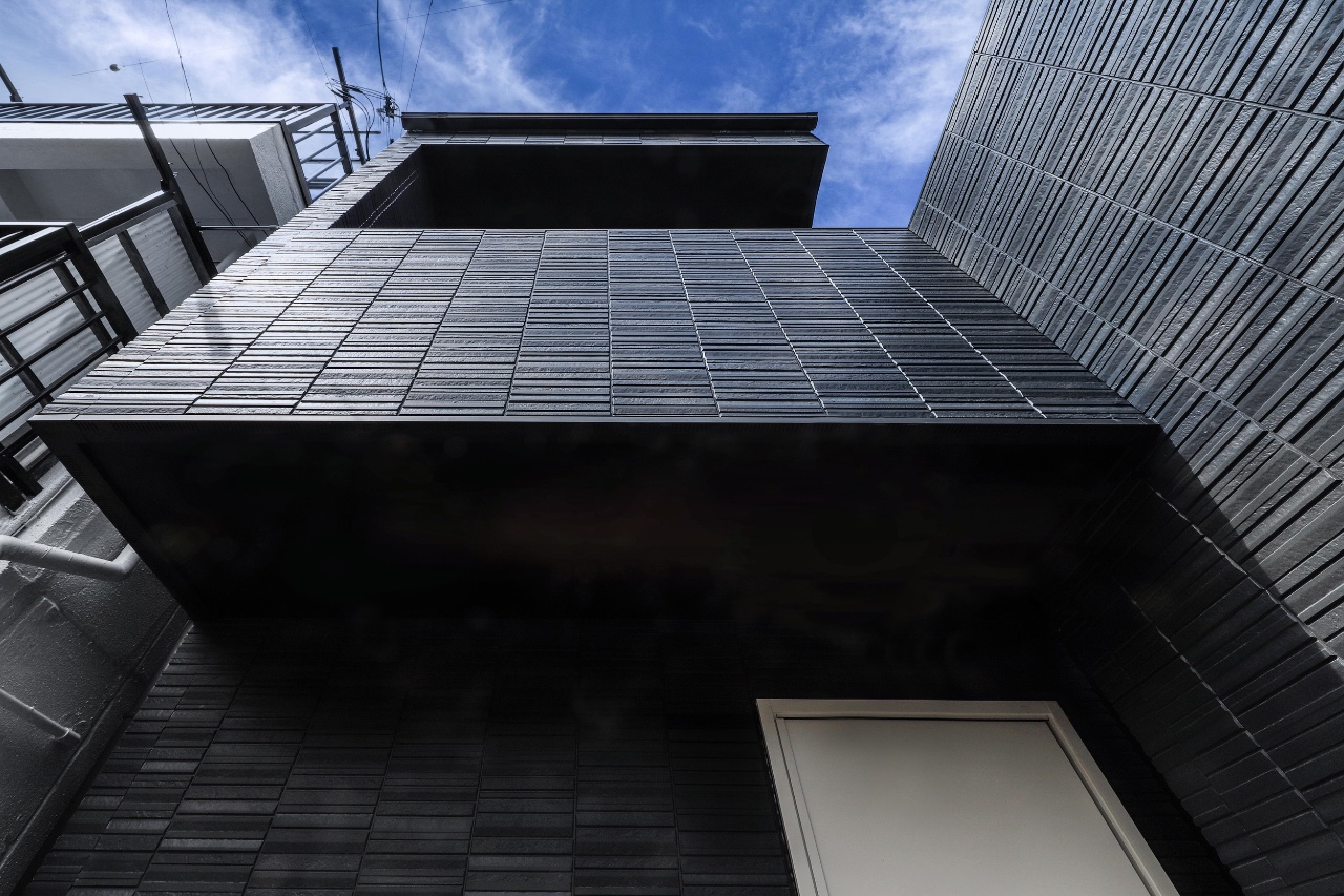 The homeowner’s primary request was to ensure maximum privacy in a densely built environment while achieving a sophisticated exterior design for the residence. The design integrates the two-story living area volume with the entrance approach boundary wall, balcony, and the western boundary wall on the second floor, along with its overhead eaves, into a continuous frame. This not only secures privacy from the neighboring properties but also lends a sculptural presence to the facade, which is less than 1.5 bays wide. The expression of the house is further enhanced by nighttime lighting. The corridor and staircase leading from the entrance to the second floor are lined with indirect lighting, and the walls are finished with textured tiles, creating a sequential experience that leads to the LDK with quality shadows.