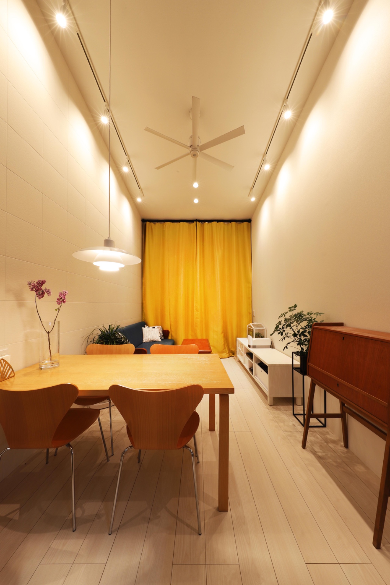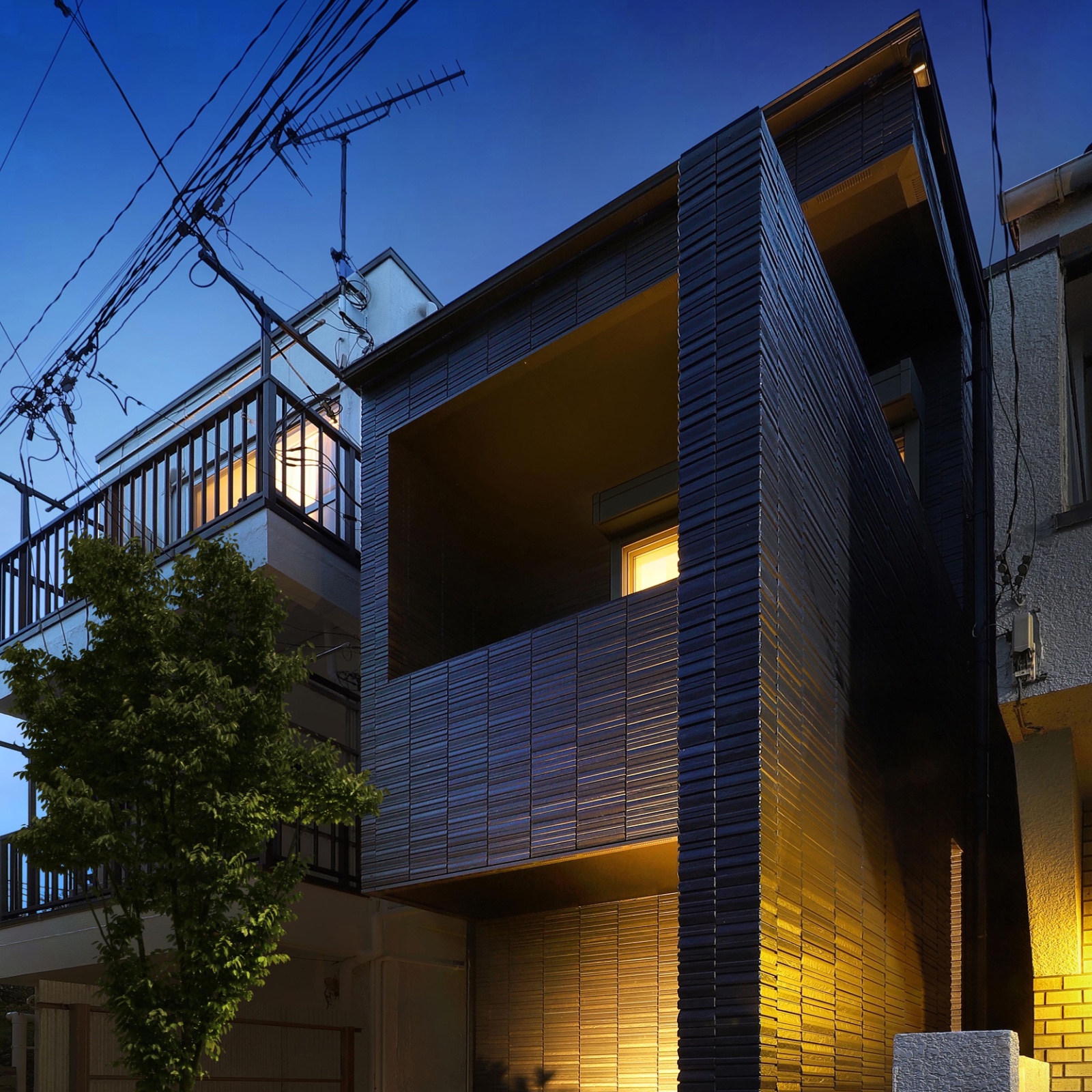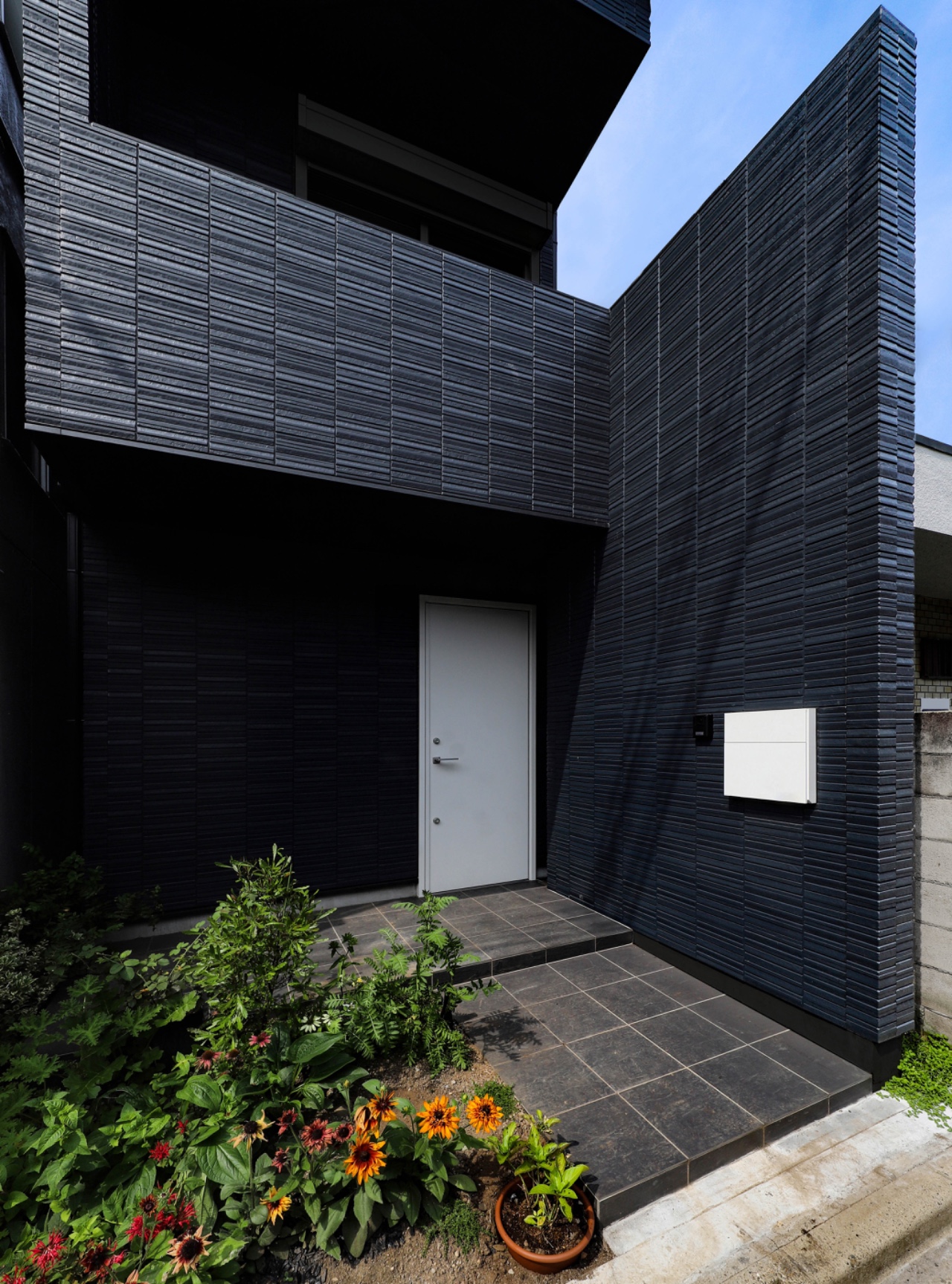 The homeowner’s primary request was to ensure maximum privacy in a densely built environment while achieving a sophisticated exterior design for the residence. The design integrates the two-story living area volume with the entrance approach boundary wall, balcony, and the western boundary wall on the second floor, along with its overhead eaves, into a continuous frame. This not only secures privacy from the neighboring properties but also lends a sculptural presence to the facade, which is less than 1.5 bays wide. The expression of the house is further enhanced by nighttime lighting. The corridor and staircase leading from the entrance to the second floor are lined with indirect lighting, and the walls are finished with textured tiles, creating a sequential experience that leads to the LDK with quality shadows.