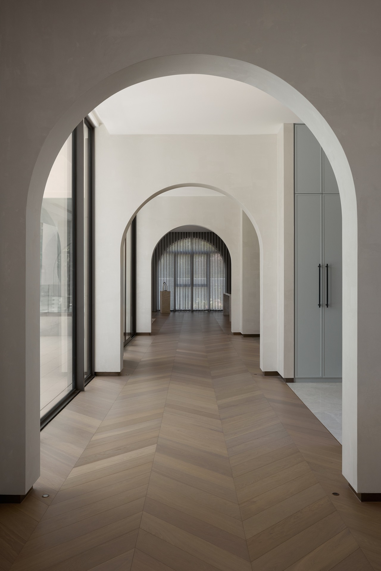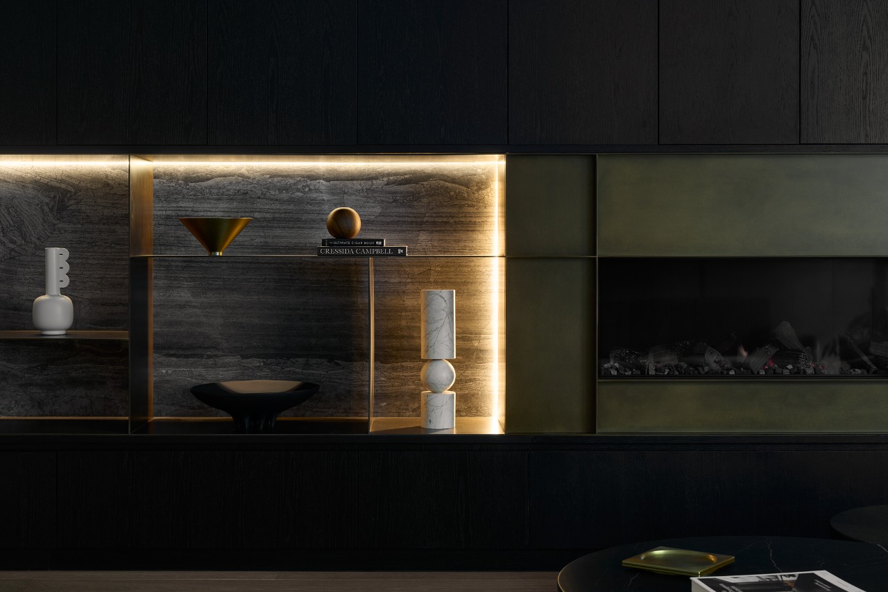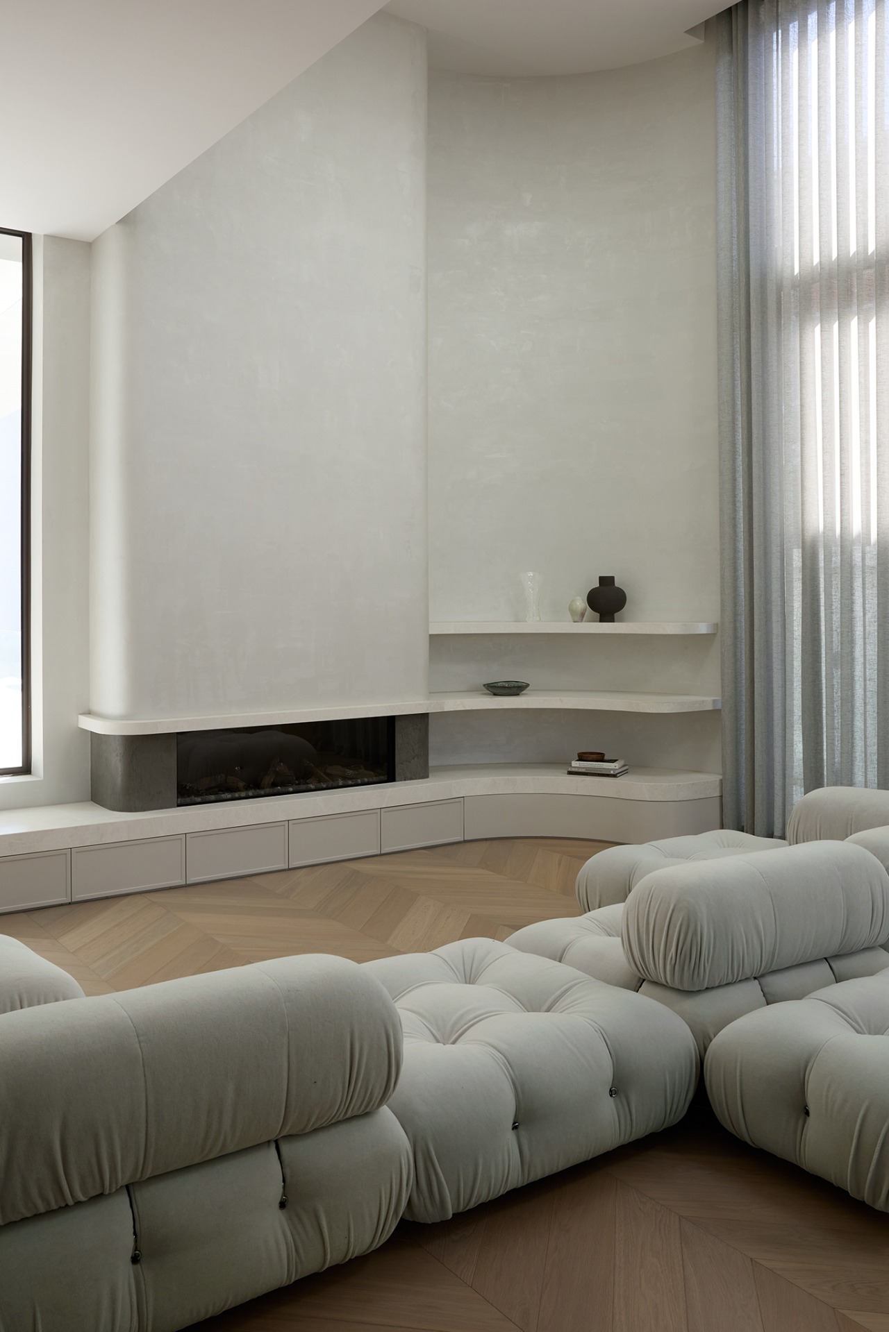 A restrained colour and material palette creates a series of frames within the home, while interstitial zones bring the exterior inside and stretch the interior out. As you move below the ground plane, the material scheme shifts to richer, darker hues within the basement. Stone and ceramic accents introduce further decadence to encourage full atmospheric immersion to zones like the bar, cellar, gym, and cinema. Boundaries are made porous through devices like transparent portals, in addition to curved forms with their potential for flow, connection and wayfinding. Temporal details of light, shadow, and the sensorial qualities of air, temperature and sound, were valued and taken into consideration during the design process.