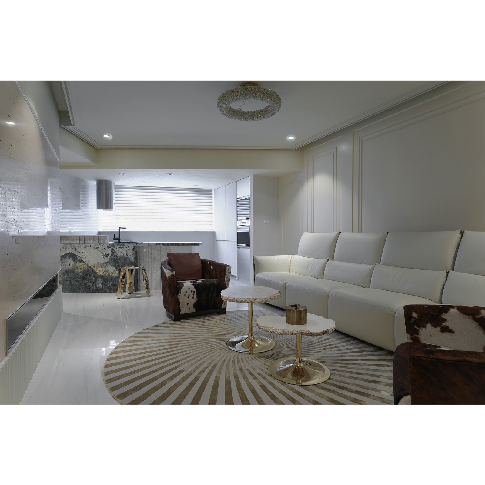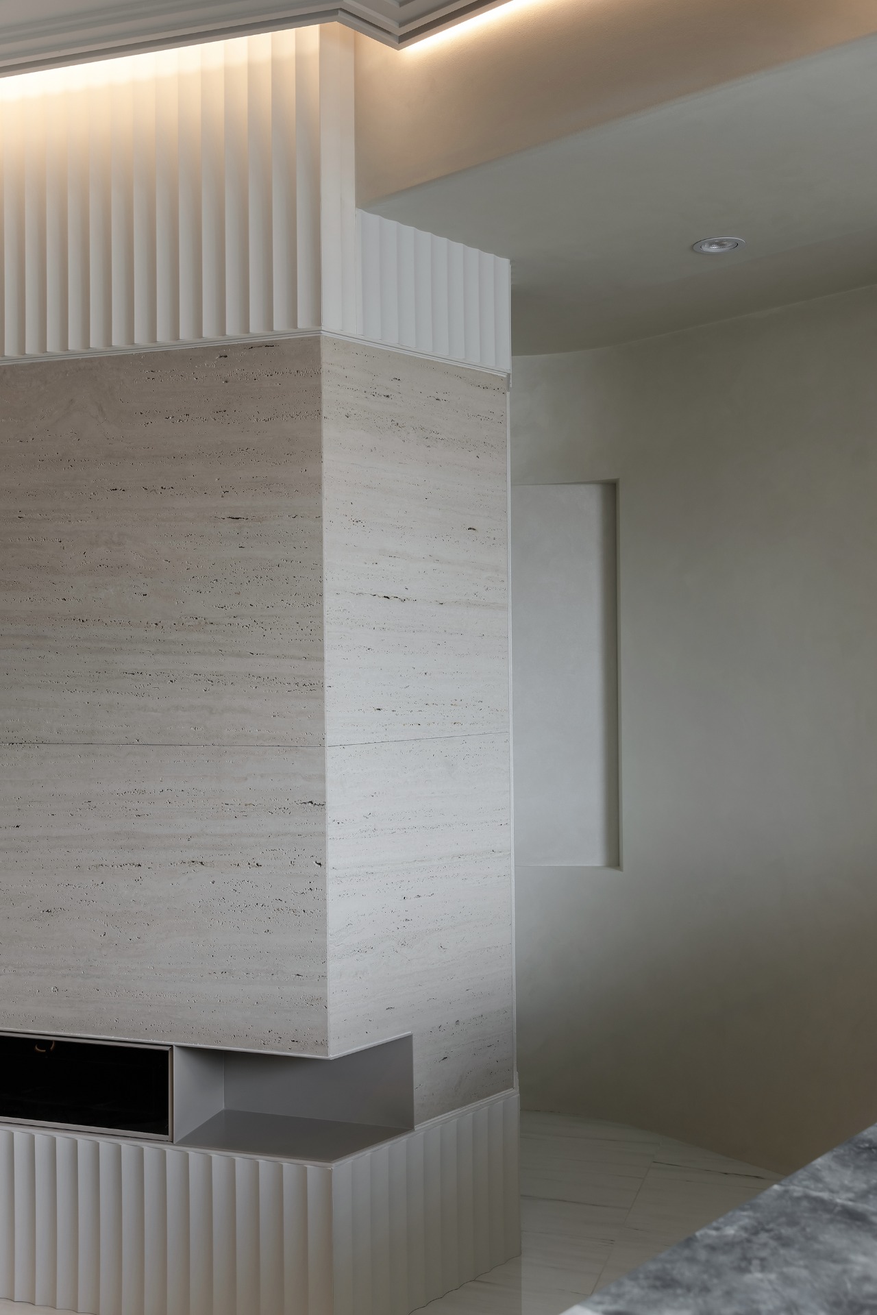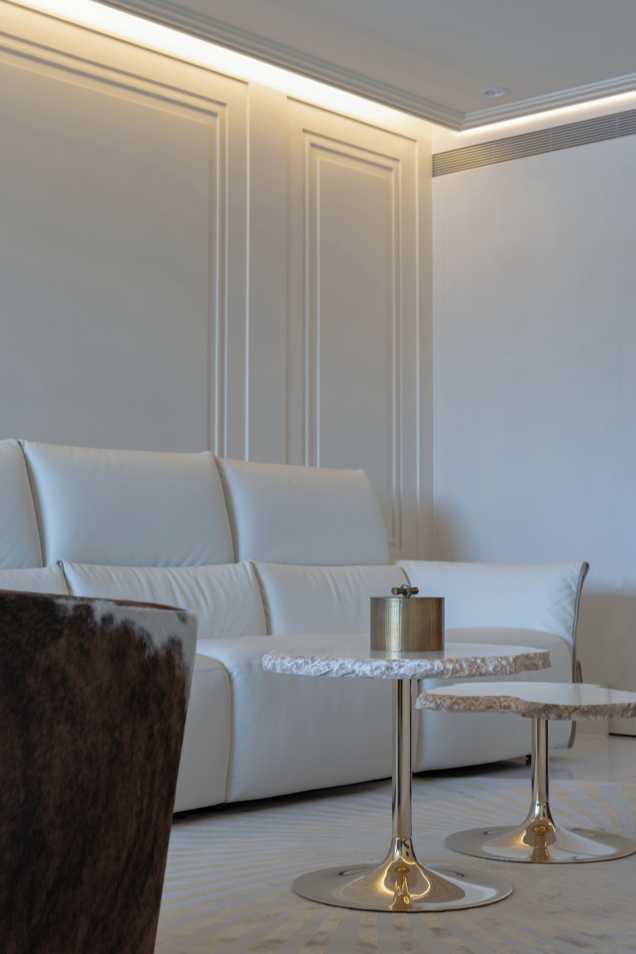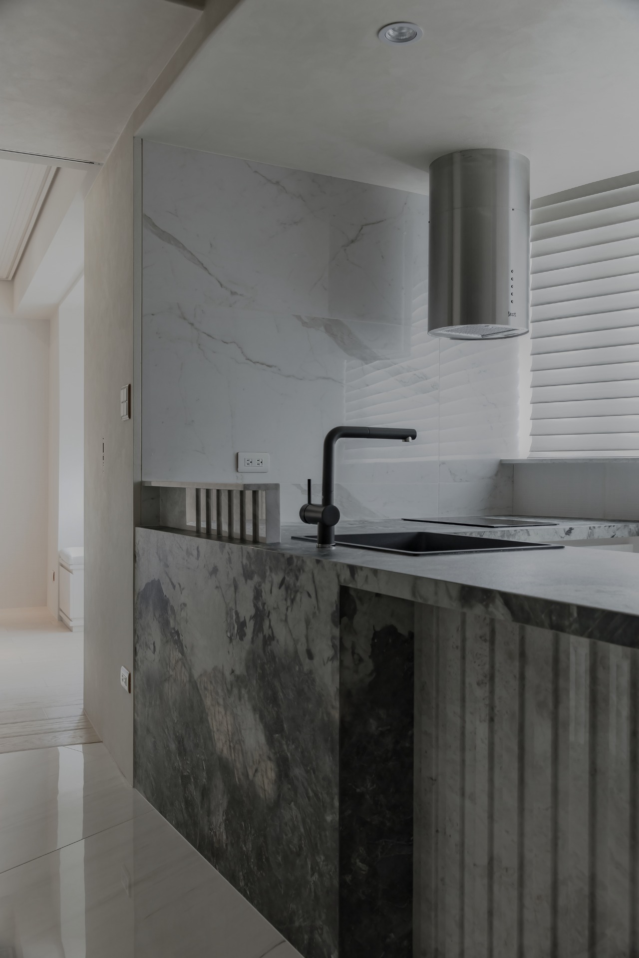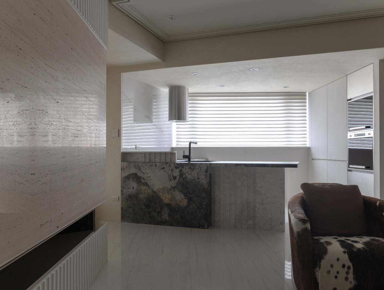 Upon entry, the kitchen island immediately becomes the focus. Green marble and white stone interlace in wave-like patterns, condensing the highlights of a luxury hotel into a compact form. In the living area, a small crystal chandelier reflects against the paneled wall, scattering soft fragments of light across the warm-toned white surface each afternoon.