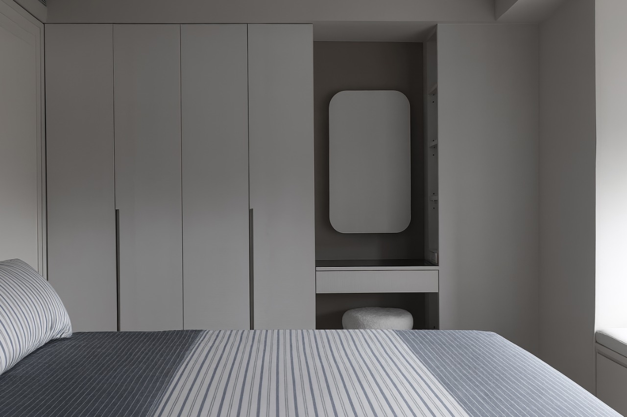 In the bedroom, the dressing table is concealed behind a discreet door for Feng Shui considerations, maintaining a tidy faƧade. Corners and ceilings are refined with gentle radii to neutralize sharp angles. Upholding the principle of āwaste-free renovation,ā the designers preserved the original stone TV wall, using color correction through coating to introduce a fresh, warm-white tone. Amid the urban bustle beyond the window, the blend of old and new materials merges naturallyāproof that thoughtful detailing can transcend time.