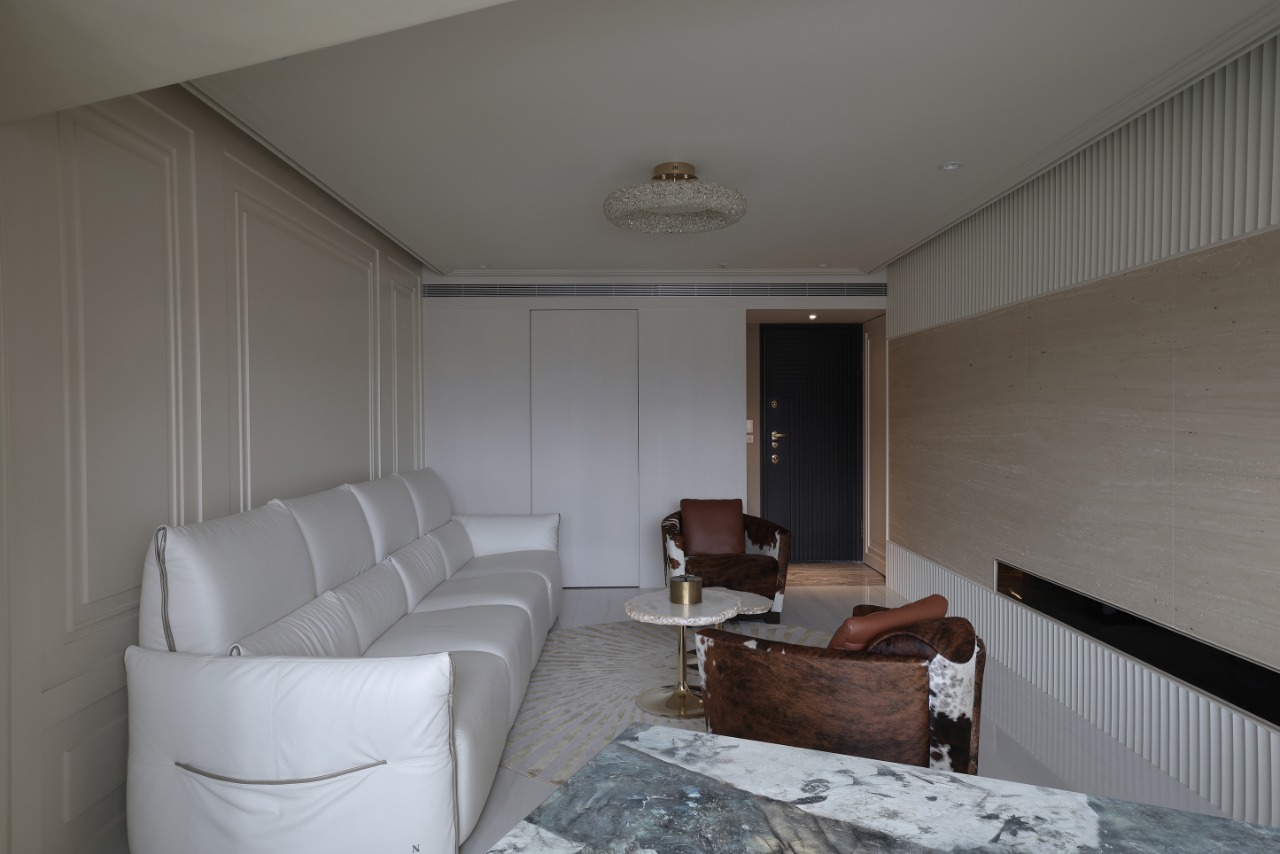 The compact 52-56 square meters residence belongs to a homeowner who has lived in New York for many years and longed to recreate the refined charm of a boutique hotel combined with the familiar warmth of an American home. The design takes cues from American moldings, French glass doors, and crystal chandeliers. Within the constraints of an old apartment building and strict management regulations, the designer integrated Western-style Feng Shui principles, such as softened corners and mirrored concealment, to craft a serene urban retreat where the owner can comfortably stay for extended visits to Taiwan.