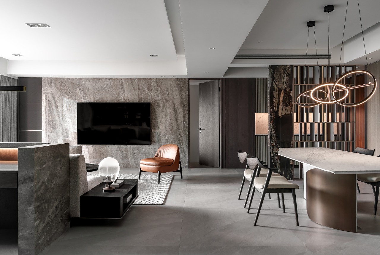 The entryway captivates with a harmonious blend of stone, textured leather panels, and intricate iron latticework, crafting a visually striking screen that gracefully balances independence and depth. As light cascades through the gaps, it sets an inviting tone, creating an enchanting prelude to the home’s atmosphere. Transitioning into the living room, one encounters a sophisticated beige-gray stone TV wall that pairs beautifully with a contrasting leather accent chair. This arrangement highlights a thoughtful dialogue between rational lines and warm textures, inviting comfort and style. Similarly, the dining area steals attention with its hexagonal marble table, distinguished by sculpturally dimensional legs that artfully combine marble and metal, enhancing the overall aesthetic. The open layout of these spaces ensures a natural flow, seamlessly connecting living and dining areas.