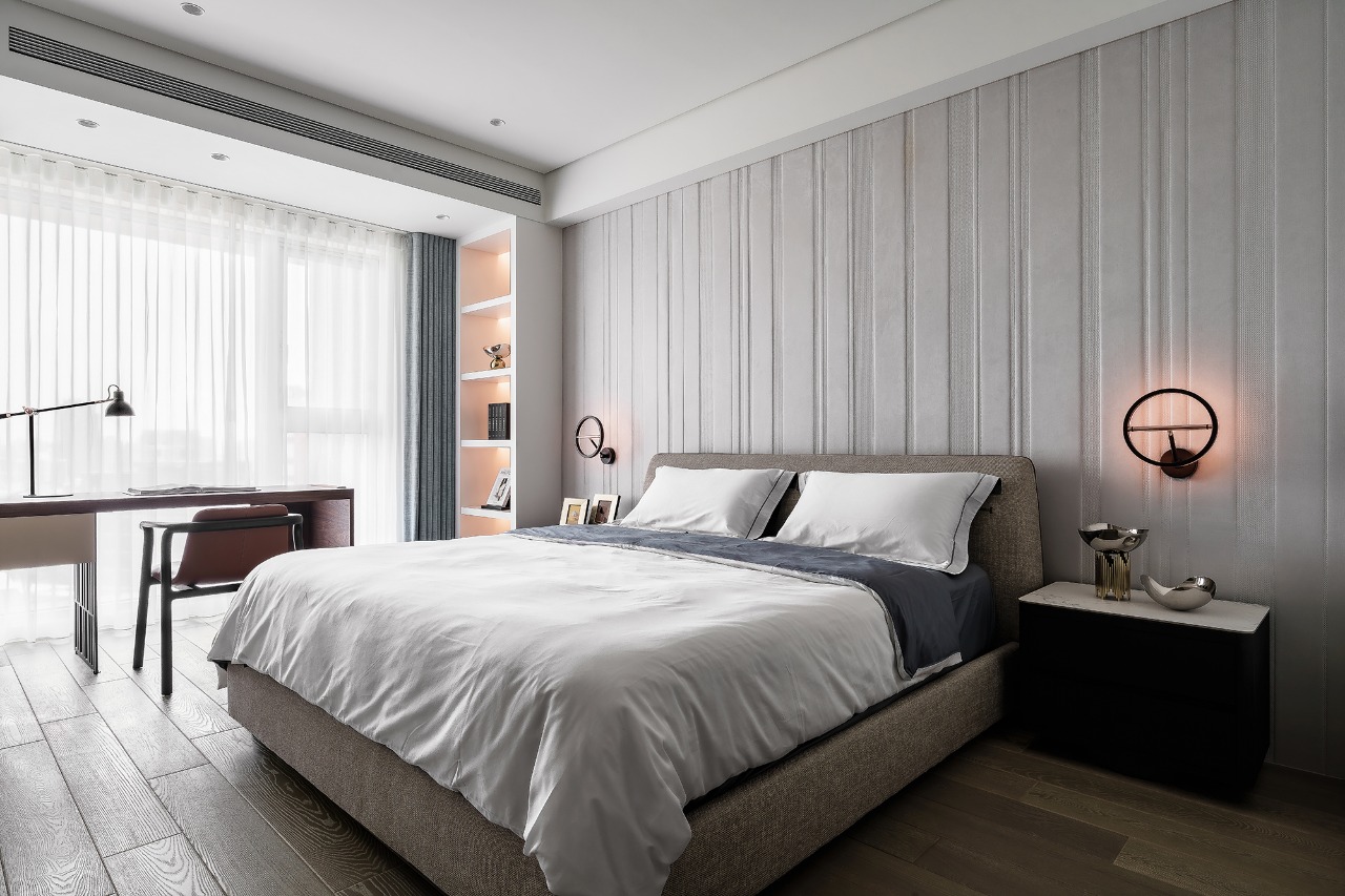 In the study, a low partition wall defines the space, while bookshelves featuring indirect lighting add both functionality and artistry. This innovative design creates a dimensional storage solution, allowing books and decorative items to shine. Furthermore, the master bedroom embodies tranquility with its elegant white palette, where timeless classical lines converge with a three-dimensional leather headboard wall that evokes the delicate beauty of fallen leaves. This design fosters a serene retreat for relaxation. In the bathroom, gray-toned stone juxtaposes against classic white molded cabinets, a strategic contrast that highlights the refined textures and elevates the overall design. Throughout the entire residence, a symphony of materials and natural light intertwines, revealing a captivating rhythm that masterfully balances rationality and emotion.
