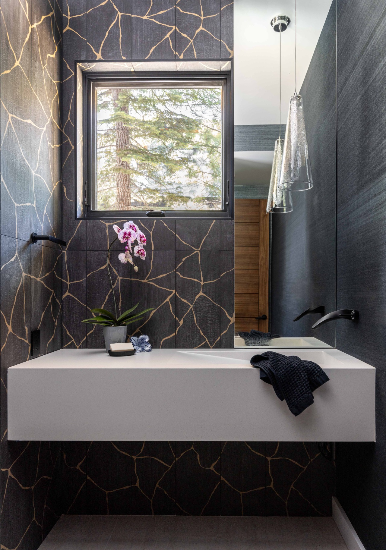 Nestled in the California Sierra Nevada Mountains is this custom new construction mountain modern styled vacation home that was built in the private gated golf vacation community of Schafferās Mill in Truckee, California. At 4,500 square feet, the home features 4 bedrooms, 4-1/2 bathrooms, an office, spauna, laundry room, and a mudroom. As a vacation home it needed to function for the family and their guests year-round. Our clients are originally from Russia and love the outdoor lifestyle that Lake Tahoe has to offer. The design objective was a modern, clean, and sleek home that was different than the surrounding homes in the community. Much of the design was inspired by European aesthetics, utilizing organic materials and patterns, and focused on rejuvenation. The exterior is a mix of concrete, steel, and wood and is situated up against the golf course with stunning views of the course and the mountain ranges. In the great room the slider opens completely connecting the interior with the exterior to take full advantage of the beautiful weather days and to connect the interior with nature. Low flow plumbing was used throughout the home as well as an energy efficient lighting system with integrated automatic shades, low VOC paints, and hydronic heating on the main level were incorporated into the design. For health and rejuvenation there is a large room called the spauna that has a large walk-in sauna, a plunge pool, a shower, a home gym, and a lounge area to sit and relax. This space also has walk out access to the back patio with the jacuzzi spa that can be used year-round with space heaters built-in to the full coverage patio and deck above. This sleek mountain modern home fits into the landscape and was tailored to our clientās personal tastes and lifestyle.