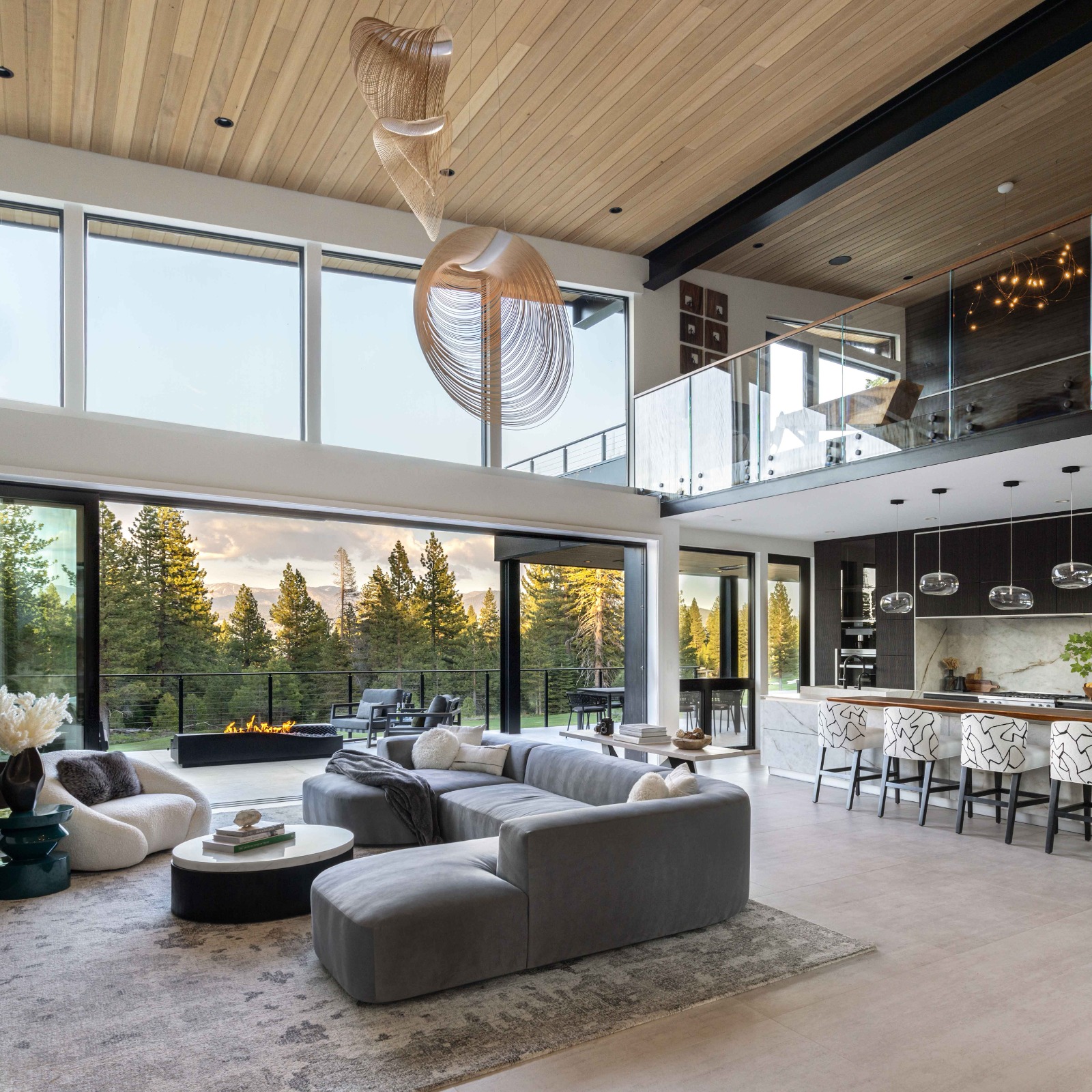 Nestled in the California Sierra Nevada Mountains is this custom new construction mountain modern styled vacation home that was built in the private gated golf vacation community of Schaffer’s Mill in Truckee, California. At 4,500 square feet, the home features 4 bedrooms, 4-1/2 bathrooms, an office, spauna, laundry room, and a mudroom. As a vacation home it needed to function for the family and their guests year-round. Our clients are originally from Russia and love the outdoor lifestyle that Lake Tahoe has to offer. The design objective was a modern, clean, and sleek home that was different than the surrounding homes in the community. Much of the design was inspired by European aesthetics, utilizing organic materials and patterns, and focused on rejuvenation. The exterior is a mix of concrete, steel, and wood and is situated up against the golf course with stunning views of the course and the mountain ranges. In the great room the slider opens completely connecting the interior with the exterior to take full advantage of the beautiful weather days and to connect the interior with nature. Low flow plumbing was used throughout the home as well as an energy efficient lighting system with integrated automatic shades, low VOC paints, and hydronic heating on the main level were incorporated into the design. For health and rejuvenation there is a large room called the spauna that has a large walk-in sauna, a plunge pool, a shower, a home gym, and a lounge area to sit and relax. This space also has walk out access to the back patio with the jacuzzi spa that can be used year-round with space heaters built-in to the full coverage patio and deck above. This sleek mountain modern home fits into the landscape and was tailored to our client’s personal tastes and lifestyle.