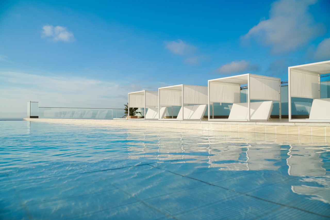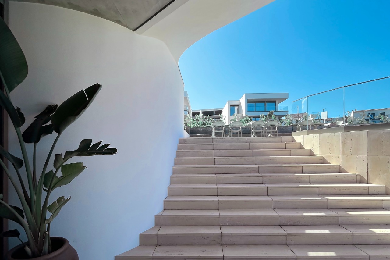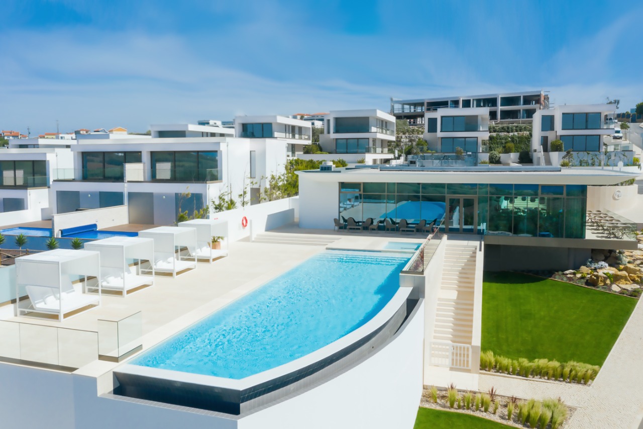 Since all development on the Silver Coast of Portugal is restricted to being built within approximately 600m of the beach by way of the POC setback, the architecture and interiors, which are intrinsically “beachfront” by location, emphasise their coastal expression by way of a refined palette of crisp white walls, low slung concrete roofs, warm pale flooring, and the ubiquitous “calçada” paving which is used lavishly to invite the public from the public footpaths into the invited public domain.
