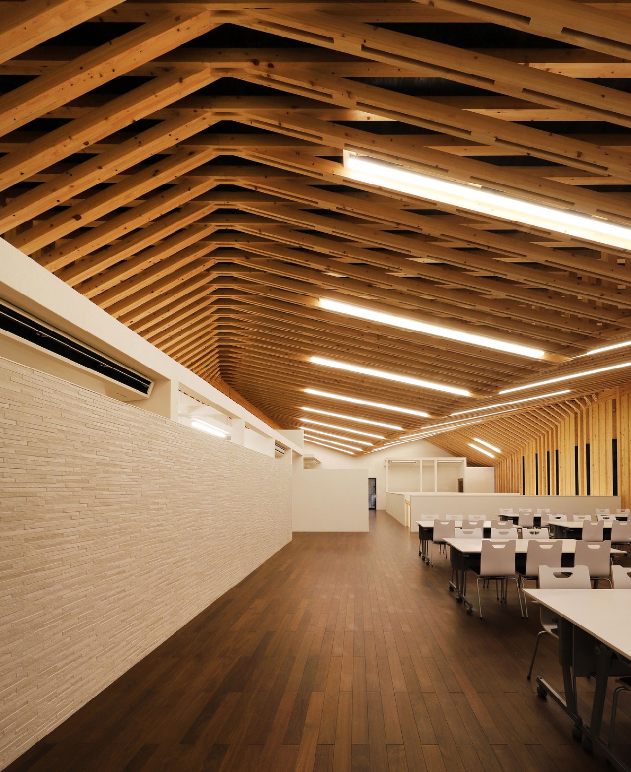 Spanning dimensions of 130 meters by 100 meters by 10 meters, the plant’s design strategically adjusts mass sections to introduce a nuanced spatial contrast, enhancing the layout’s simplicity and functionality. This design technique facilitates diverse functionalities, including viewing aisles, truck berths with expansive canopies, and office spaces. The office area, representing the plant’s forefront, merges spaciousness with structural ingenuity through the use of scissor trusses constructed from smaller-dimension lumber, complemented by 120mm square Japanese cypress pillars and 30mm thick cedar boards for load-bearing walls. These wooden elements, left exposed, double as a showcase for the builder’s precut craftsmanship, akin to a showroom.