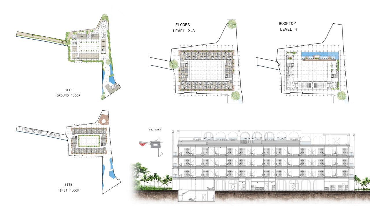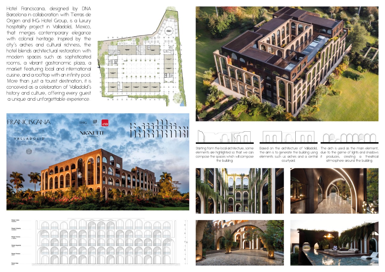 Hotel Franciscana is luxury hotel that redefines hospitality, blending elegance, sophistication, and history in the heart of the “Pueblo Mágico” of Valladolid, Mexico. Situated in an iconic plaza in the city, the hotel rises as an artistic landmark, offering guests a unique and enriching experience. Its colonial architecture, where arches play a central role, creates an atmosphere that plays with light and shadow, framing the structure and highlighting every corner with an artistic touch. Every detail has been carefully designed to reflect the rich cultural heritage of the region. From its luxurious hotel rooms, where comfort meets sophistication, to the common spaces that evoke the grandeur of a theatrical setting. The hotel includes a plaza that features dining, shopping, and art experiences, where guests can enjoy various restaurants and a food-market space offering both international cuisine and regional flavors from Yucatán. Additionally, the rooftop offers a leisure area with an infinity pool that, through the arches, frames the beauty of Valladolid. Restoration and preservation of colonial art and architecture are fundamental pillars of the project, creating an environment where history and modernity coexist in harmony. Hotel Franciscana is not only a luxury retreat but also a place where the regional culture and the rich heritage of Valladolid are celebrated in every detail, making each stay an unforgettable experience.