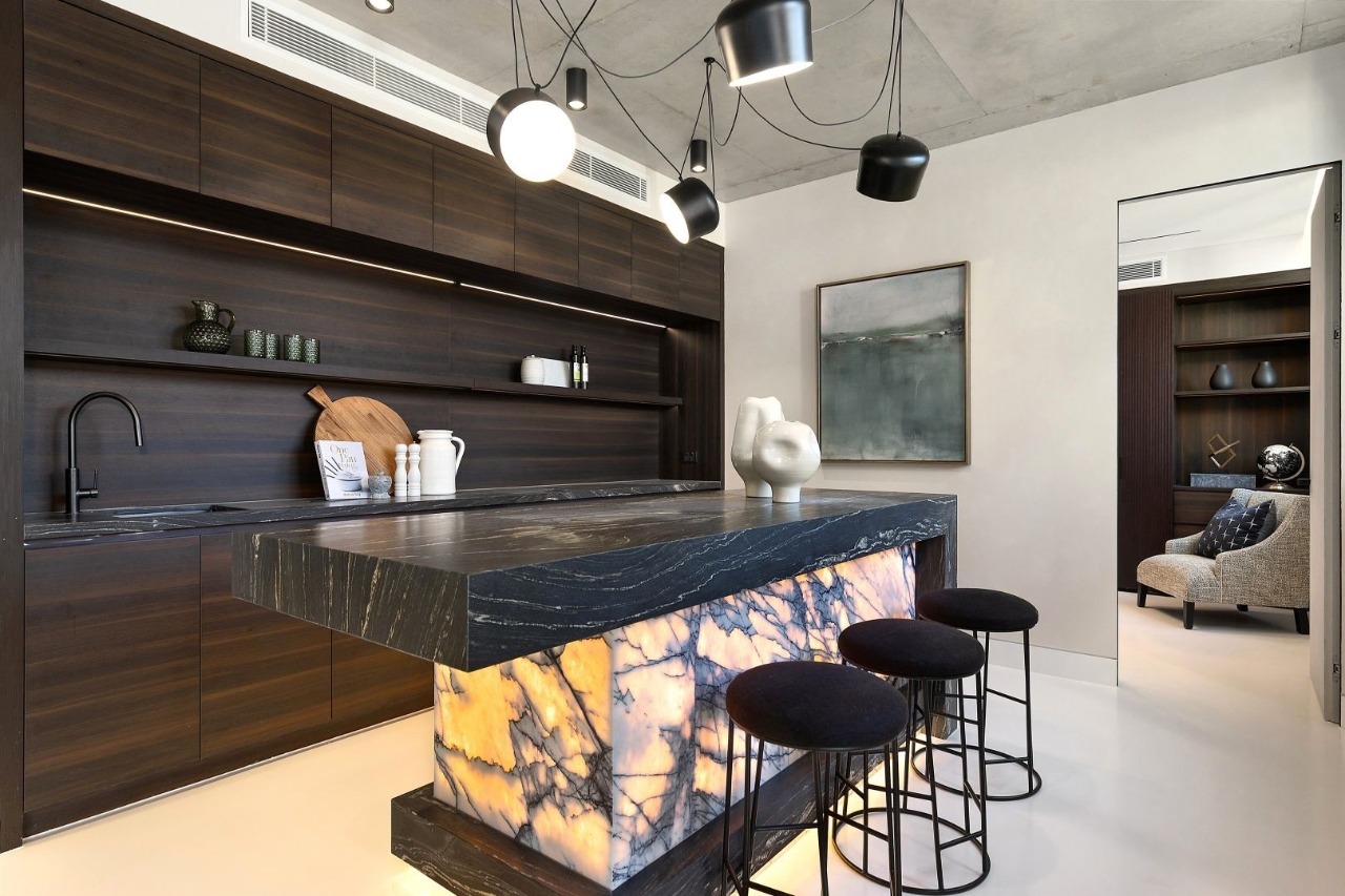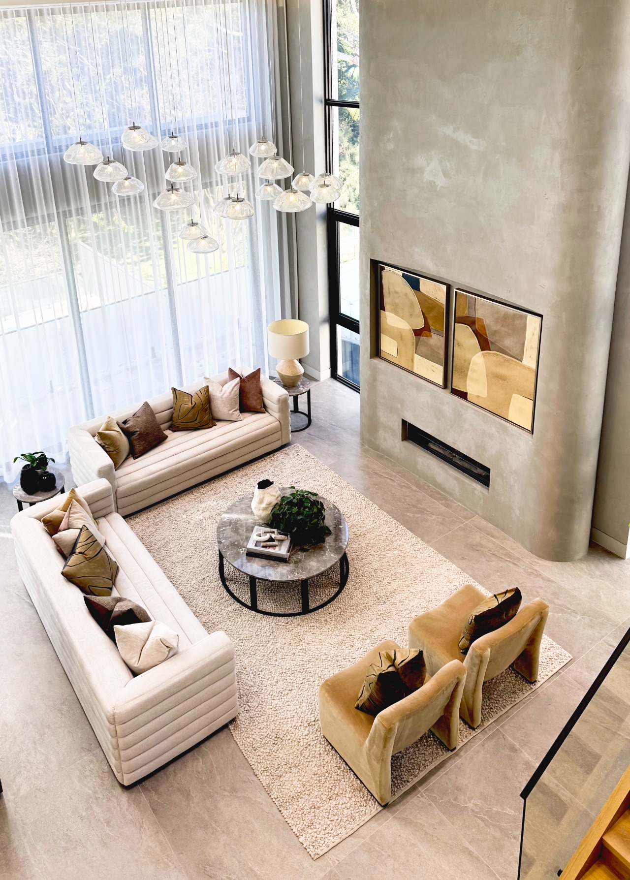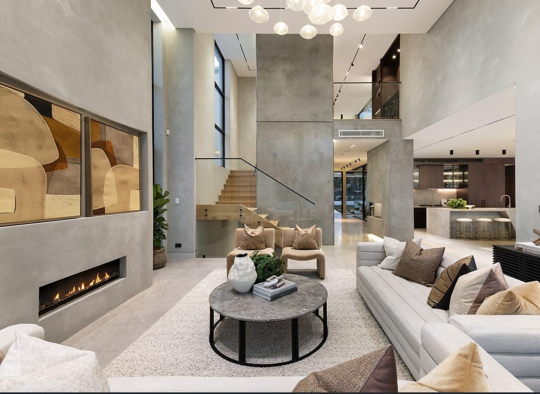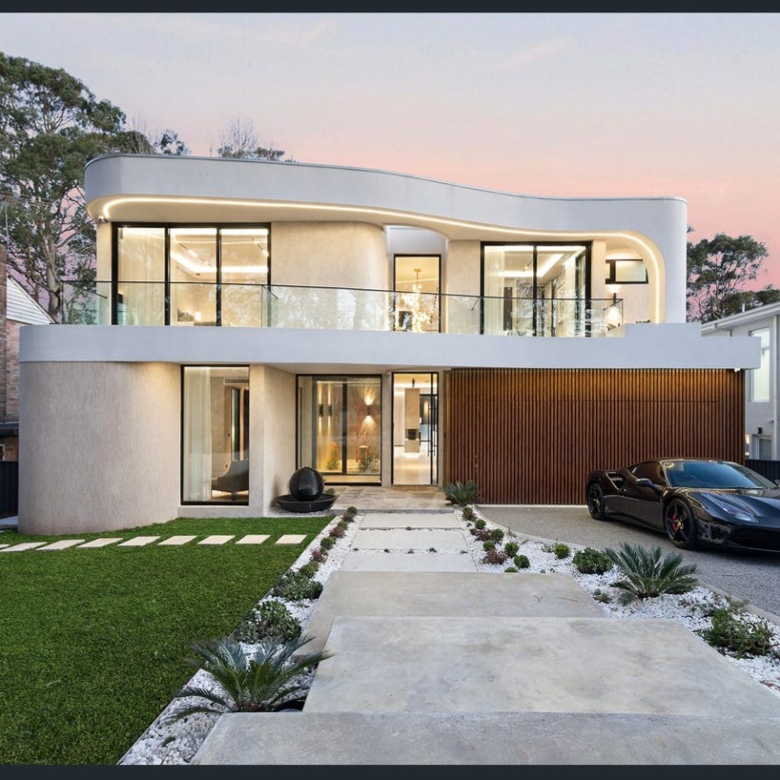 Materiality is simple and tactile: smooth stucco-like render, warm timber battens, polished joinery and expansive glass work together to balance refinement and domestic warmth. The timber battens conceal service zones while giving rhythm and texture to the façade; internally, soft, natural finishes reinforce a sense of calm.
