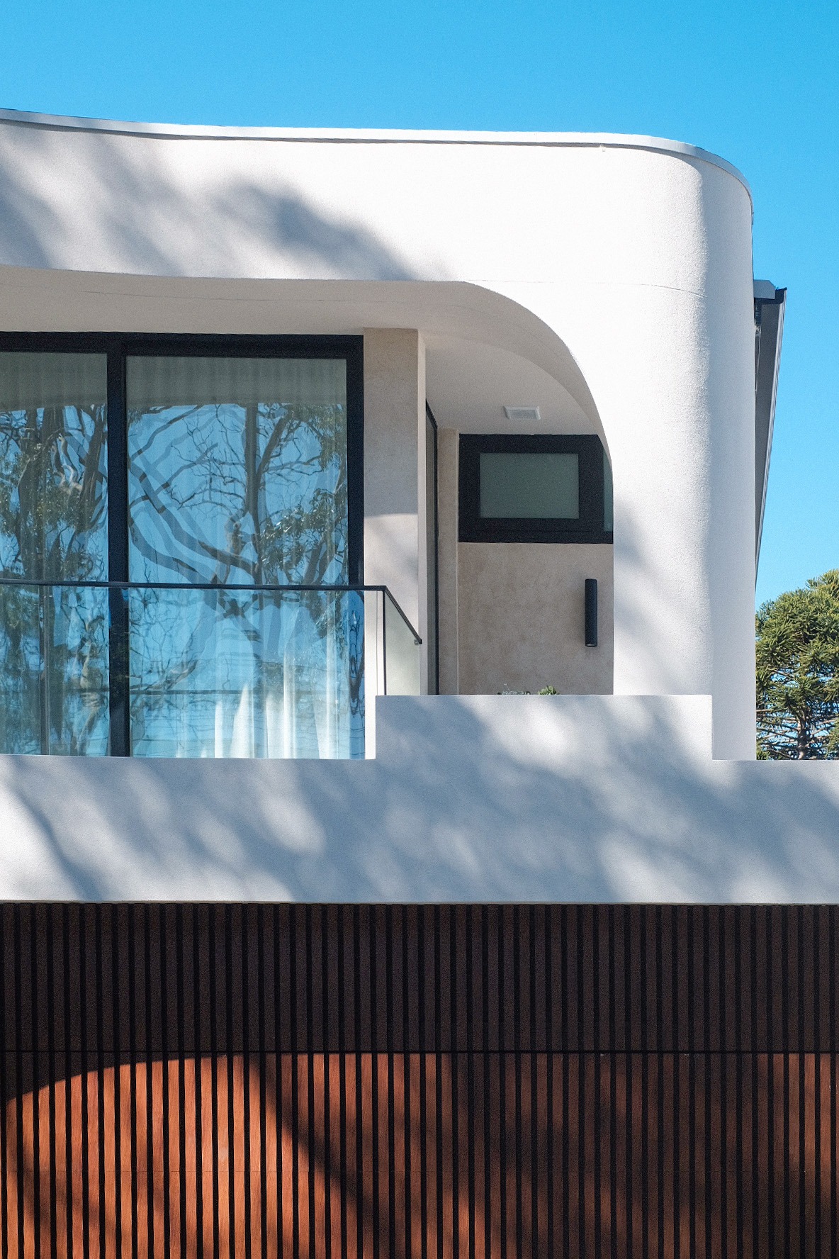 The design negotiates a suburban context through a composition of sculpted volumes and a restrained material palette. A continuous, curving upper form — rendered in a smooth white finish — sits above a grounded base articulated by vertical timber slats and generous glazing. This deliberate contrast between soft, continuous geometry and finely detailed linear elements gives the house a calm, modern presence that reads both at a human scale and from the street.