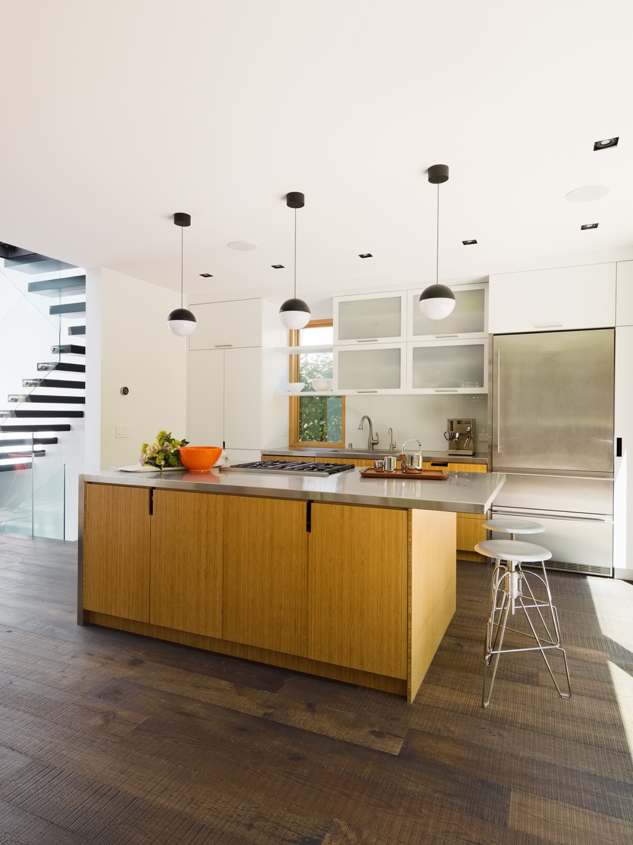The materiality is intended to feel relevant and modern but also fitting for the home’s heritage. Glass, metal and wood are crisp and unfussy – a reflection of our casual and unpretentious clients – and dark rough-sawn wood floors bring warmth. There are also notes of blonde bamboo in the cabinetry and interior window frames, which are new but fabricated in the same size and shape as the originals. With several skylights throughout, including in the primary bathroom, the quality of light is brilliant and views to the garden and surrounding trees brighten the interiors, creating a sense of serenity despite the urban locale.