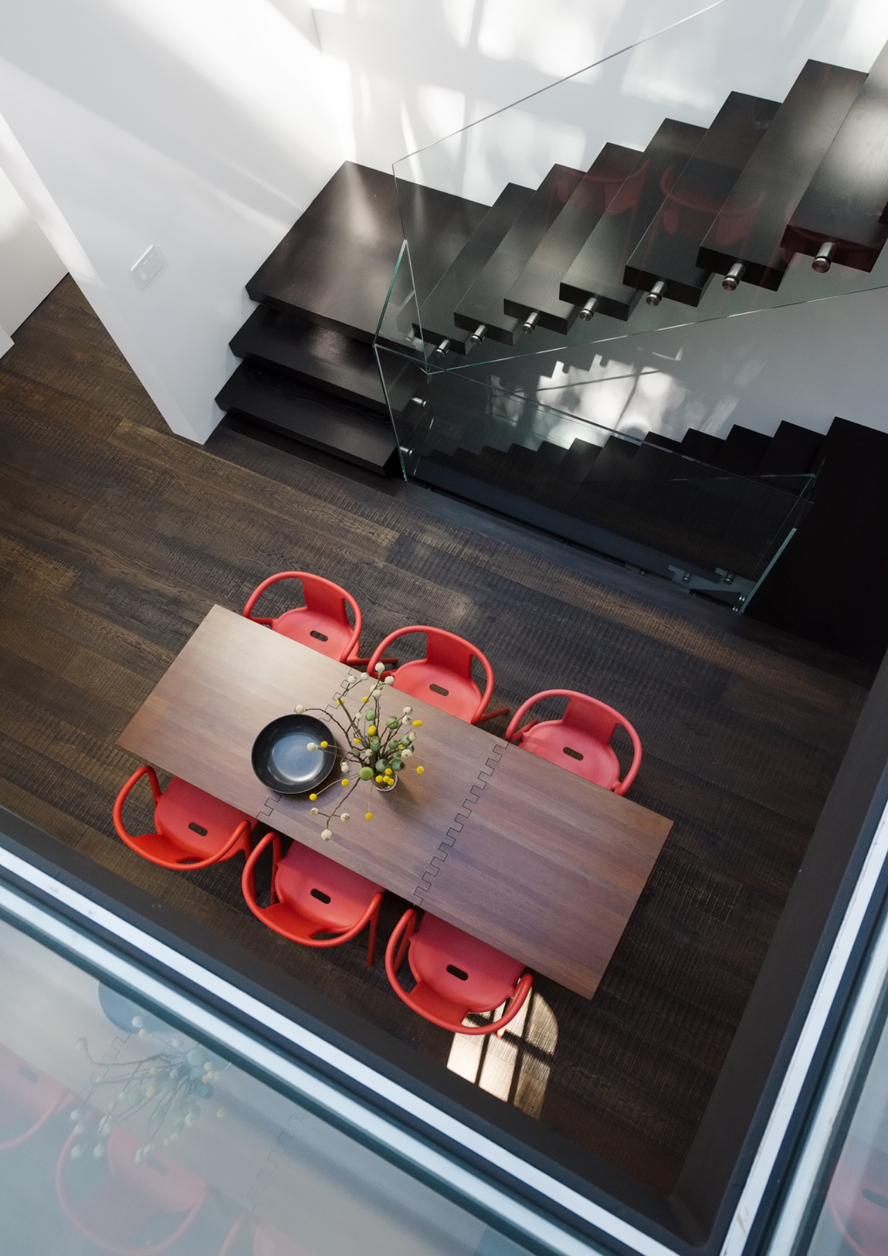 Inside, we reimagined the layout to facilitate a more contemporary way of life for our clients. As well as converting existing crawl space to habitable square footage and making additions at the first and second levels, we completely opened up the central part of the U-shaped plan. Here, we removed most of the second floor, creating a double height dining space at the heart of the home. A cantilevered steel and glass staircase wraps the room and a new skylight above floods the void with natural light, emulating the feeling of an atrium. While this bold design move decreased the home’s square footage, it undoubtedly enhances the quality of the space and reveals the home’s innate grandeur.