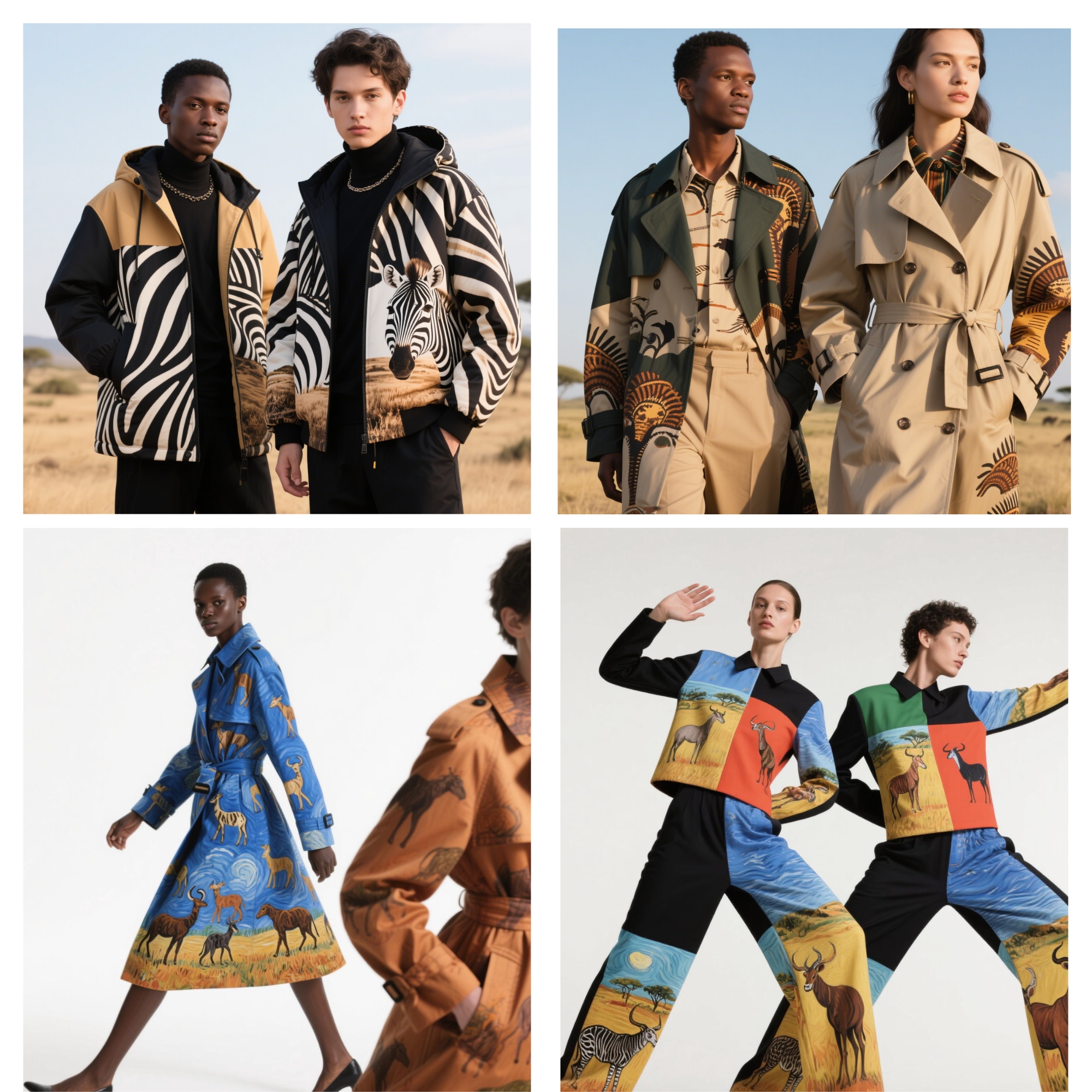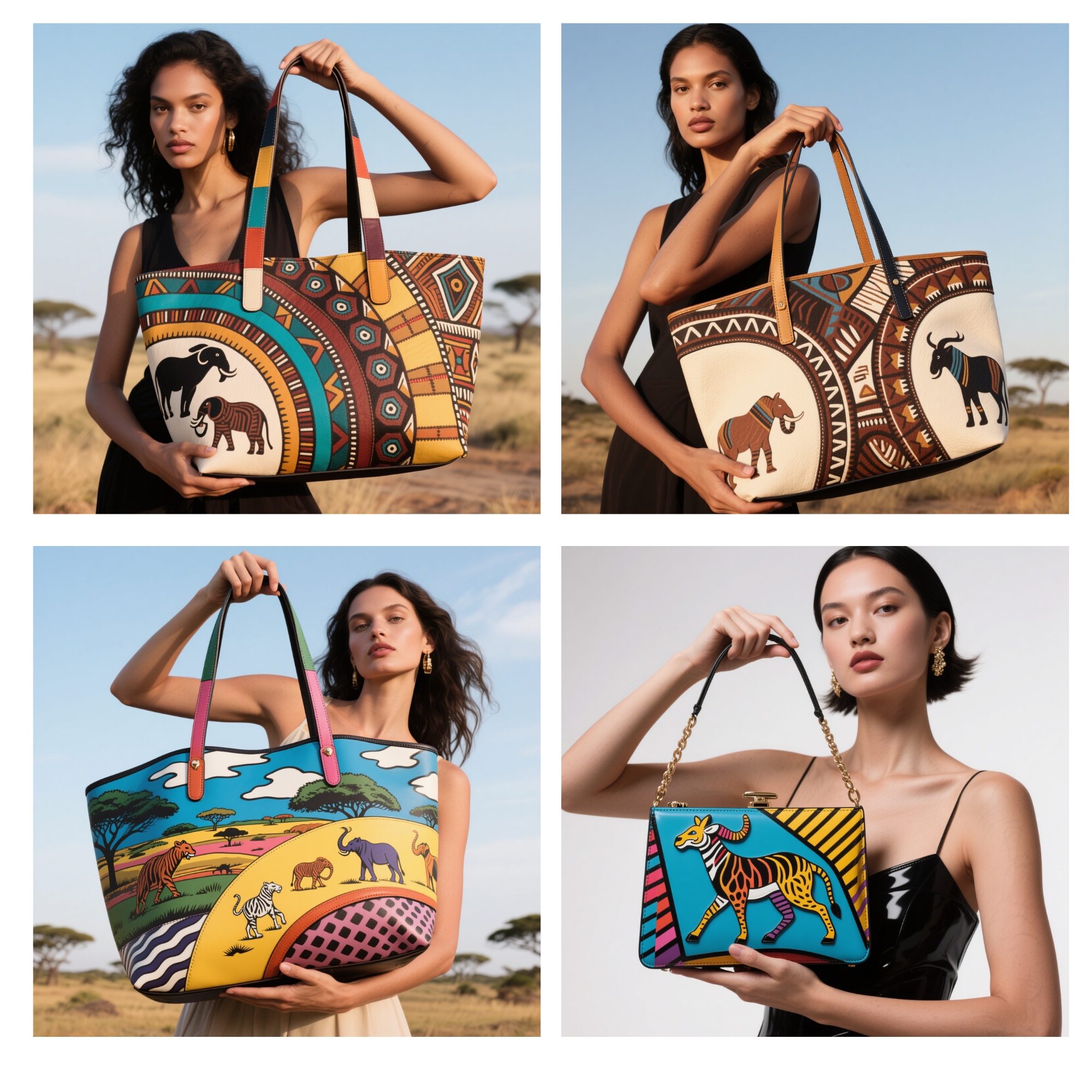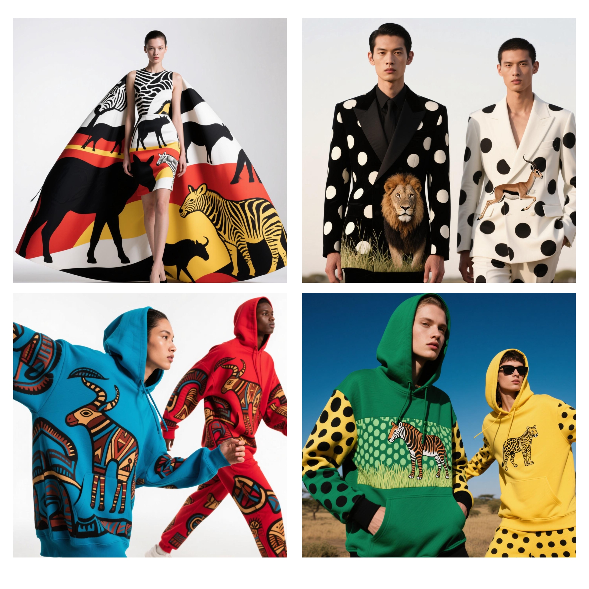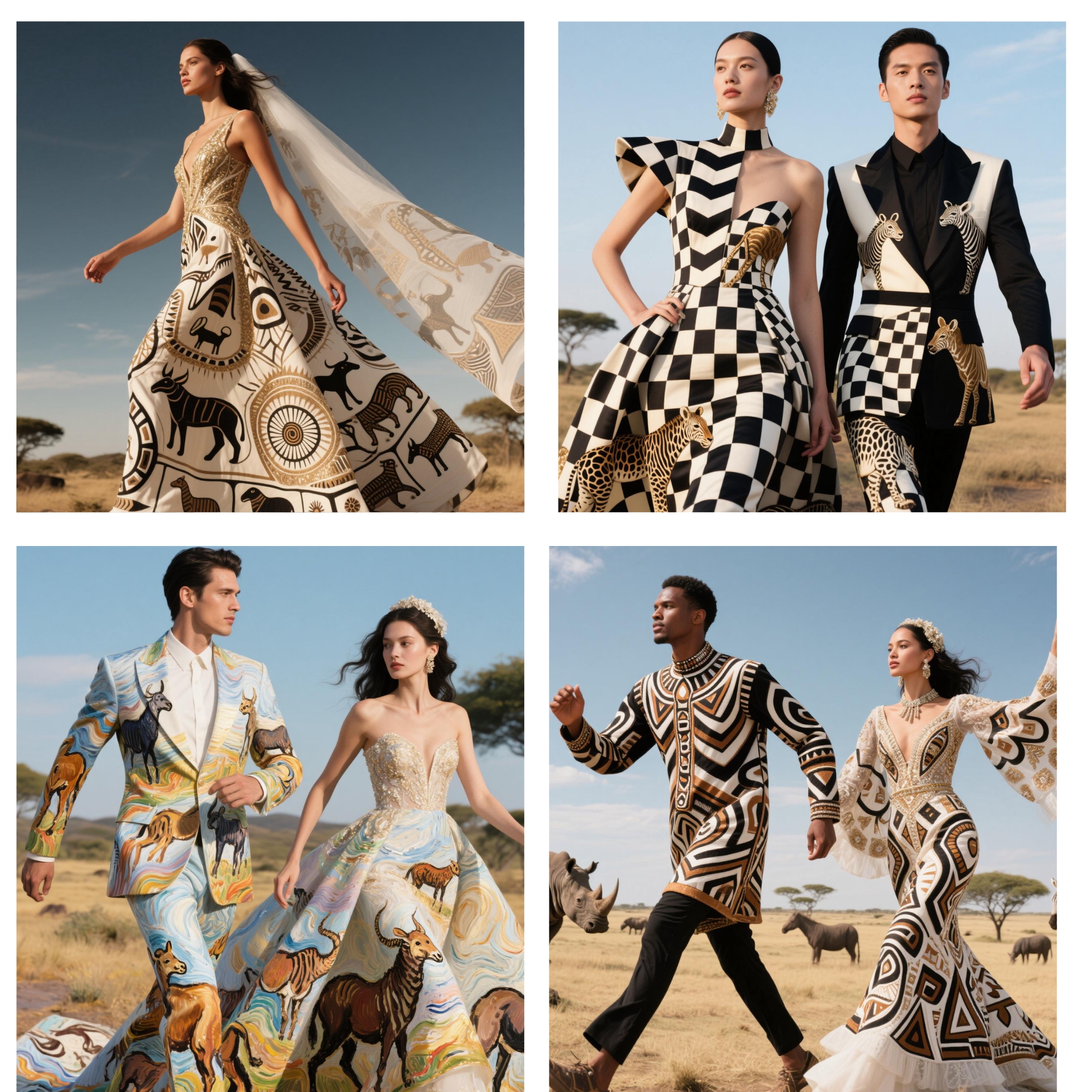Drawing from African wildlife, tribal totems, and symbolic rituals, each piece translates tradition into contemporary elegance. Our visual language fuses impressionism, abstraction, and pop sensibilities, allowing ancient motifs to find new life in silhouettes that walk both runways and everyday spaces. The leopard, the drum, the sun god—all reimagined through color, texture, and bold forms.