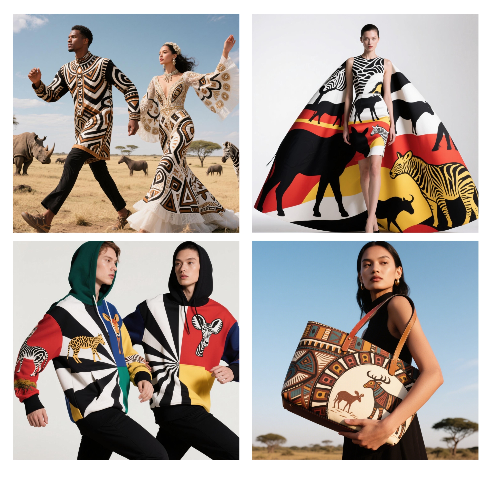 Drawing from African wildlife, tribal totems, and symbolic rituals, each piece translates tradition into contemporary elegance. Our visual language fuses impressionism, abstraction, and pop sensibilities, allowing ancient motifs to find new life in silhouettes that walk both runways and everyday spaces. The leopard, the drum, the sun god—all reimagined through color, texture, and bold forms.