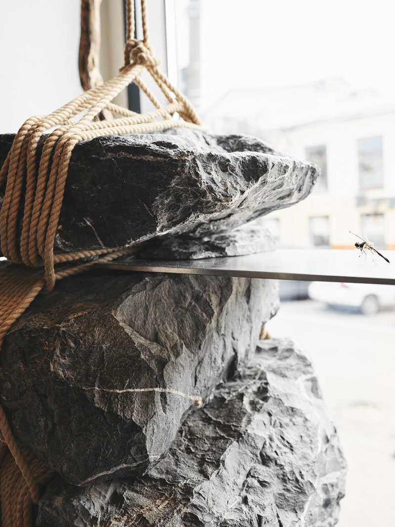 Upon entering the compact lobby, guests are greeted by a mountain of stones in a dimly lit and lushly textured space. Upon closer inspection, it becomes clear that these “boulders” are an allusion to an ancient animal trap. Each stone has its own special role in this form: one serves as a bait, another as a trap lid tied with jute, the third as a continuation element.