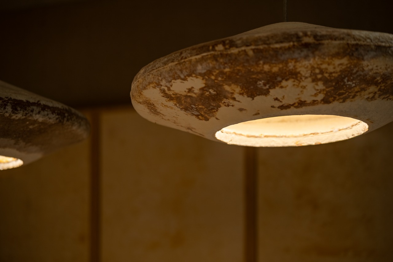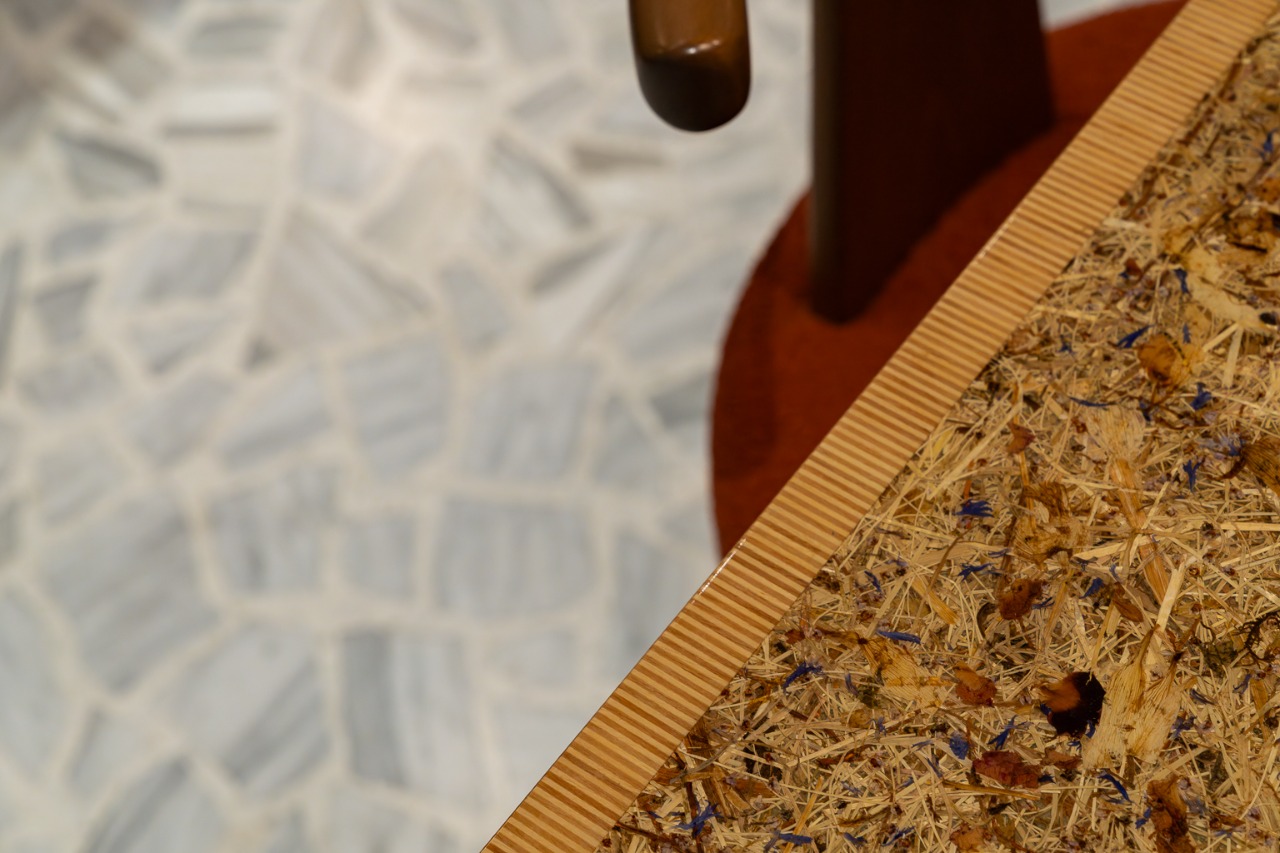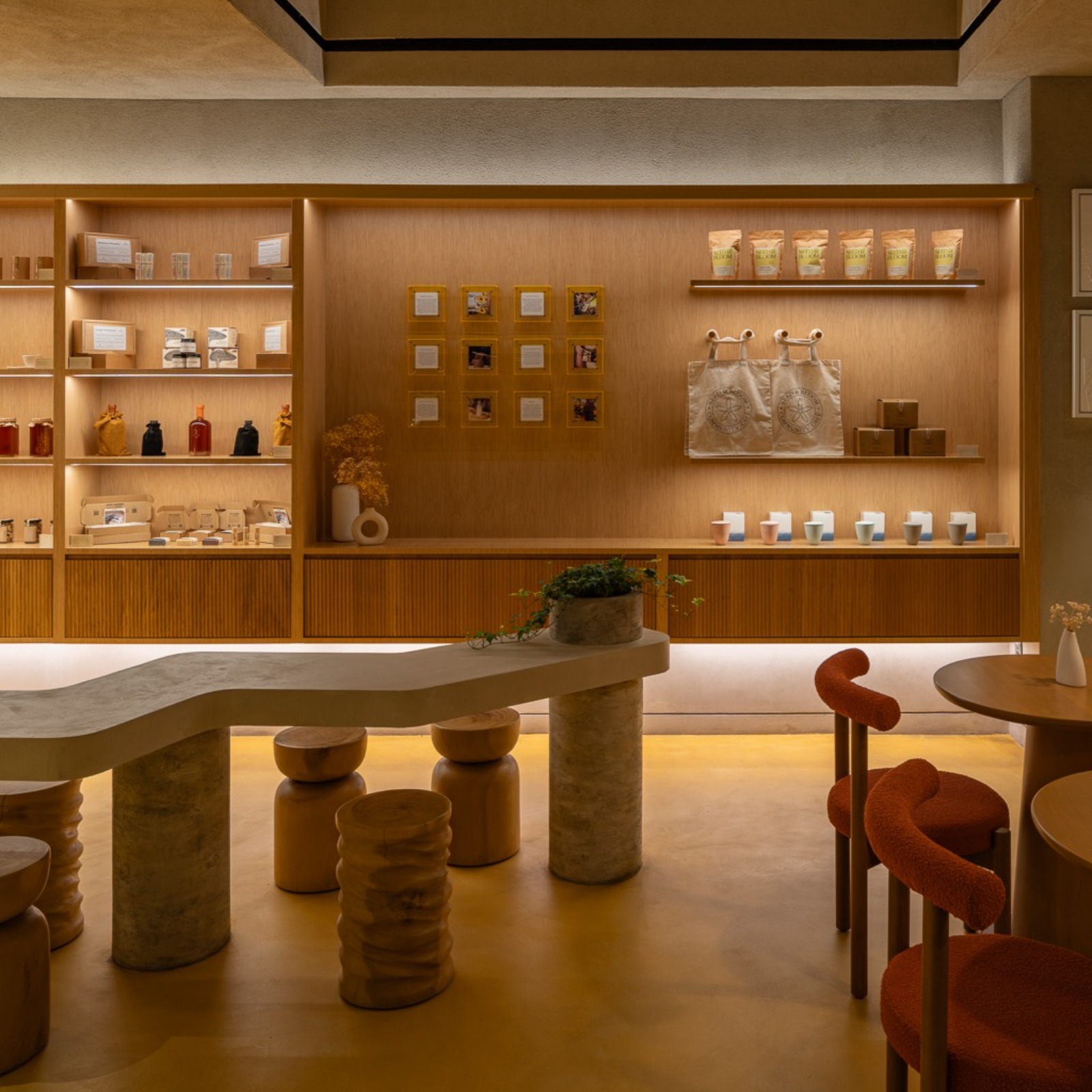 The venue’s eco-social impact is shaped by inclusive programming and deep community engagement. The community flex space accommodates workshops like ceramics, focaccia-making, and flower arranging—often led by local makers—creating space for skill sharing, enterprise support, and connection; building a platform for social inclusion. The retail displays within the café are also stocked with goods from local makers and home-grown businesses that craft in the UAE and support sustainable practices. Community group gatherings further reinforce its role as a platform for social inclusion. Beyond social impact, key materials were selected to support eco-minded decision making and regional education; such as Mycelium wall and floor panels and pendants, clay plaster and natural floral panels.