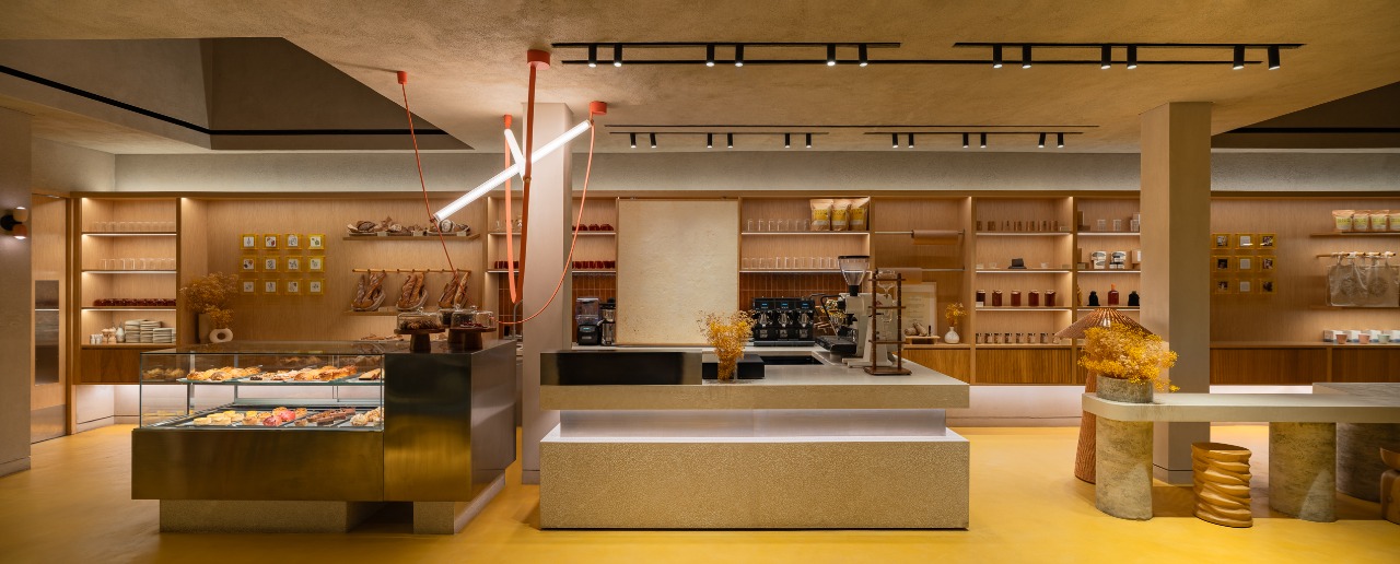 Seed & Bloom’s creativity is expressed through its narrative-led concept, brand identity, and storytelling. The colour palette was inspired by the desert hyacinth, a local desert flower that relies on a natural interdependent system to bloom (similar to that of a community), while ideas of transformation were showcased through materiality and spatial design. Materials utilised different techniques to illustrate craft and process, with sightlines to bakery and workshop areas re-enforcing transformation as process at the hands of bakers and the community.