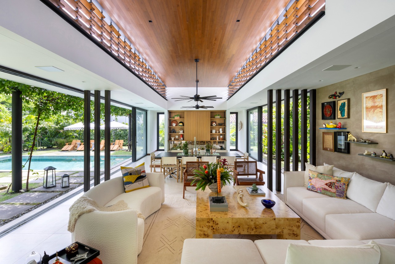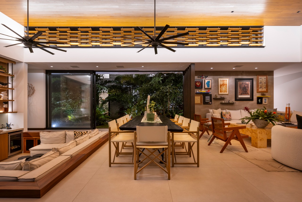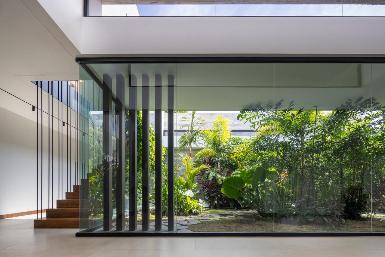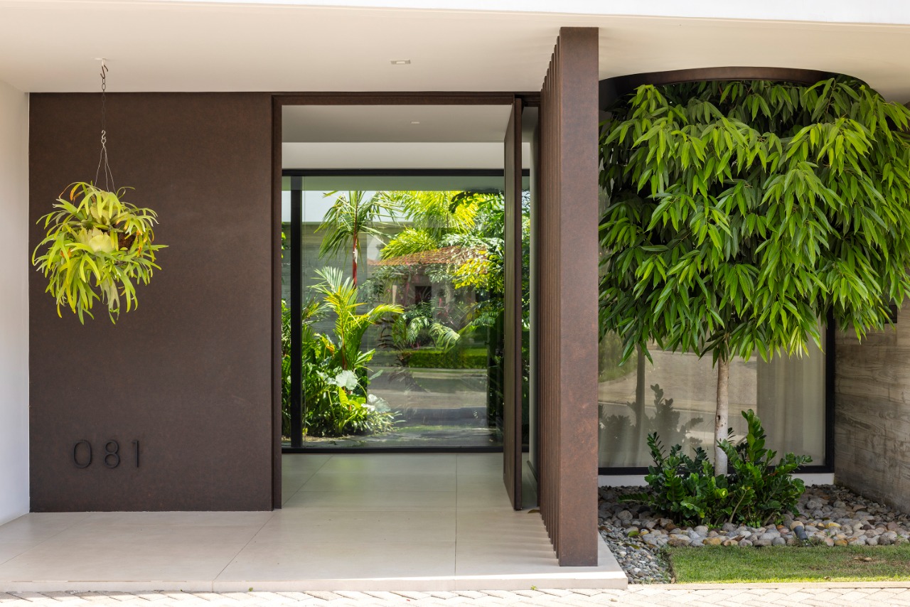 The entrance, defined by a transitional threshold, anticipates the experience of the central garden, offering a sense of transparency without compromising the home’s intimacy. A palette of honest materials—exposed concrete, steel, and wood—paired with abundant greenery, establishes a warm and timeless narrative that enhances daily living. Inside, spaces unfold seamlessly, with generous openings that blur the boundary between indoors and outdoors. The living room, dining room, and social spaces maintain a constant dialogue with the garden, encouraging cross ventilation, natural light, and climatic comfort.