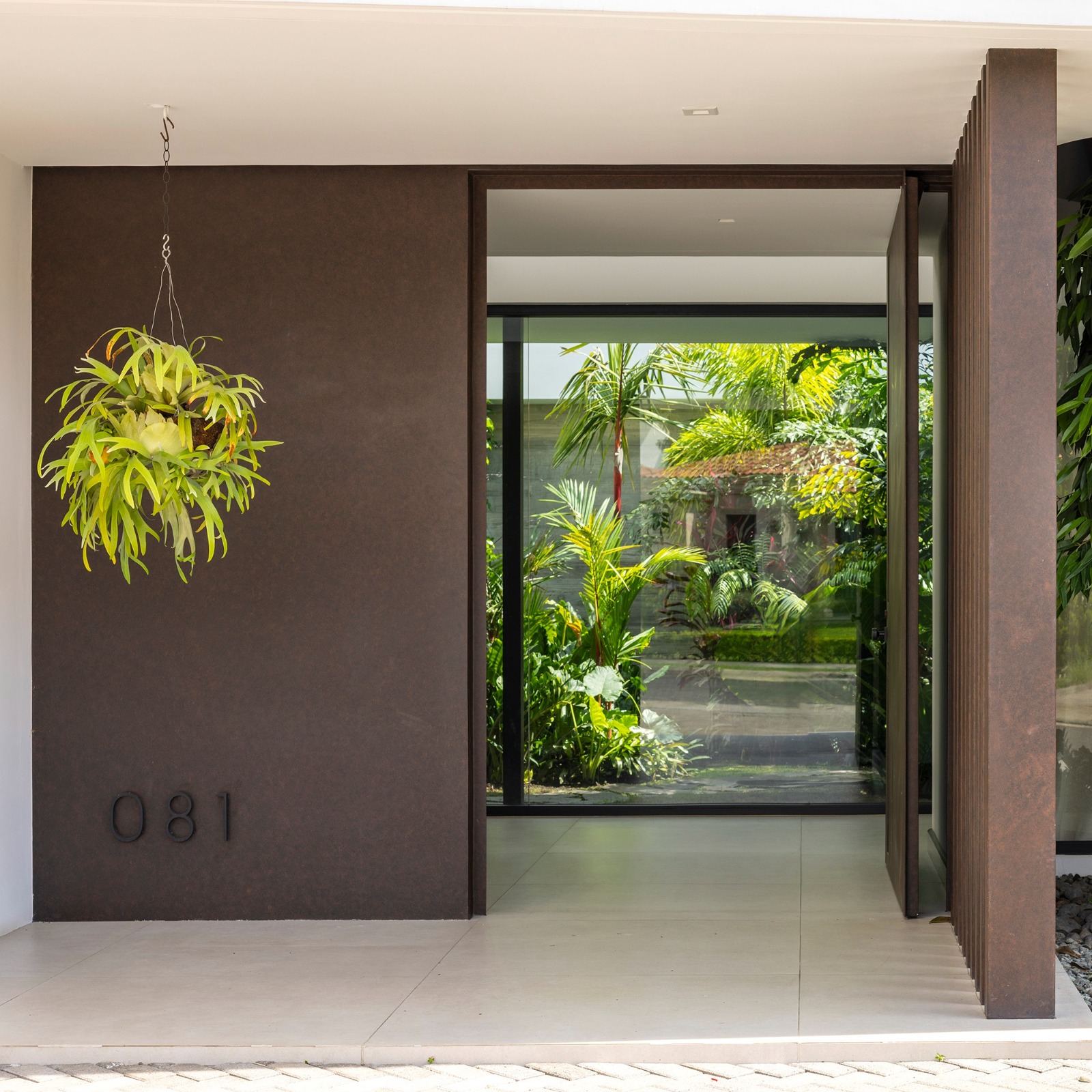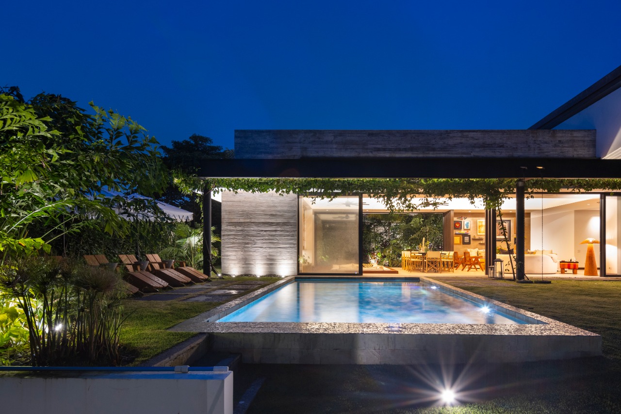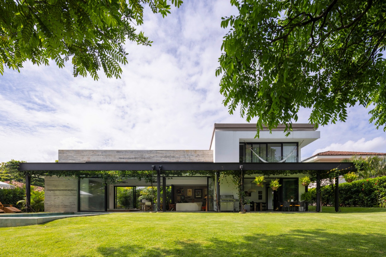 The entrance, defined by a transitional threshold, anticipates the experience of the central garden, offering a sense of transparency without compromising the home’s intimacy. A palette of honest materials—exposed concrete, steel, and wood—paired with abundant greenery, establishes a warm and timeless narrative that enhances daily living. Inside, spaces unfold seamlessly, with generous openings that blur the boundary between indoors and outdoors. The living room, dining room, and social spaces maintain a constant dialogue with the garden, encouraging cross ventilation, natural light, and climatic comfort.