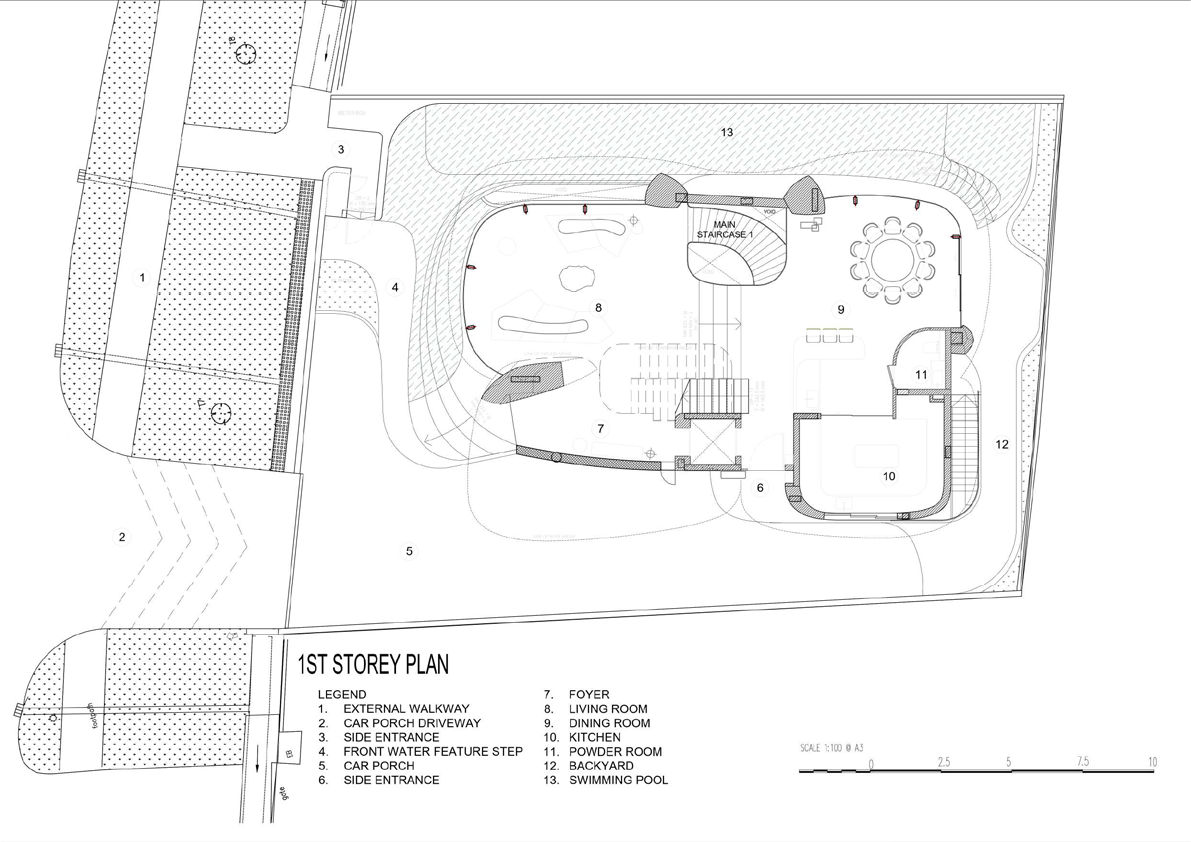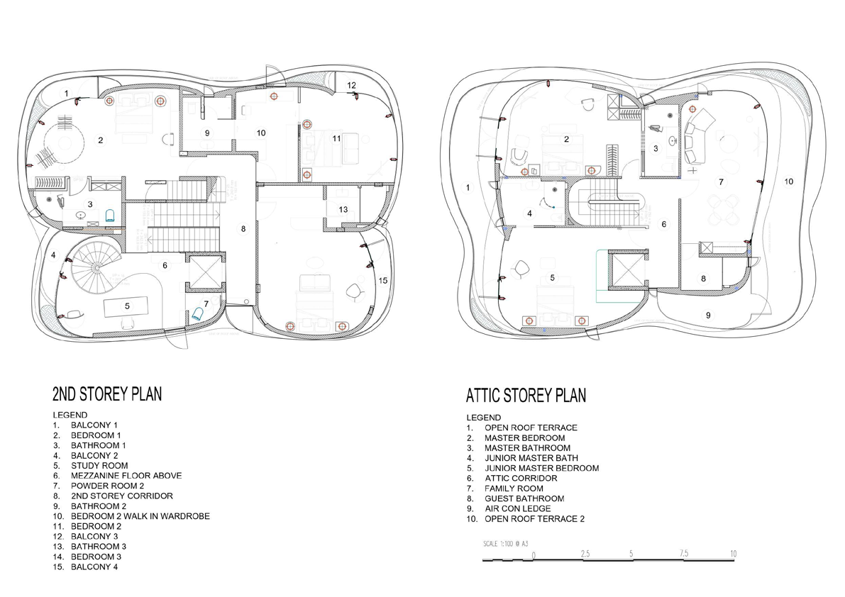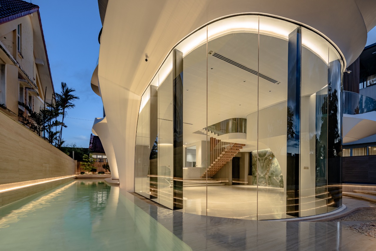 This house is located along a major road and is intended to be a visually striking. The use of sculptural organic forms serves to blend architecture and landscape. The house floats above and seemingly grows out of a cascading water body, with muscular columns swooping upwards to become roof eaves for shade, while creating column-free spaces for the car porch and living spaces below. The eaves protrude to provide shade, and blends to create balconies and planters for the bedrooms, bringing touches of landscaping upwards. Full height frameless glass faƧade allows for the house to have almost invisible connections from the interiors to the exteriors, for example in the living room overlooking water features. The base of the house is anchored with a travertine finish, with the lap pool and cascading water feature seemingly carved out of stone. These water bodies wrap around the living dining spaces, and is completed aurally by a water feature within the house which creates a tranquil rippling sound. Split level concepts are introduced for better connections across floors. For example, the living room is semi-sunken, this also achieves greater headroom and greater privacy (from road).