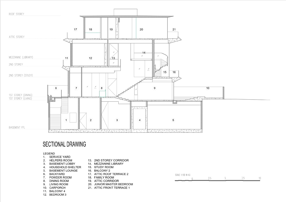 The client wanted maximum built areas – a basement is introduced where large entertainment rooms, gym and the service zone are. The circulation is centrally located with bedrooms at the corners so panoramic unblocked views at upper floors are capitalized fully.