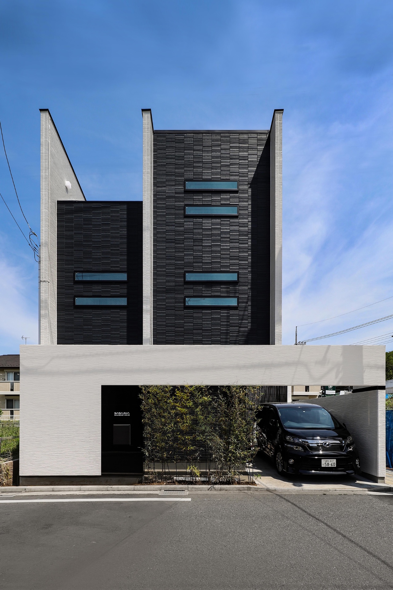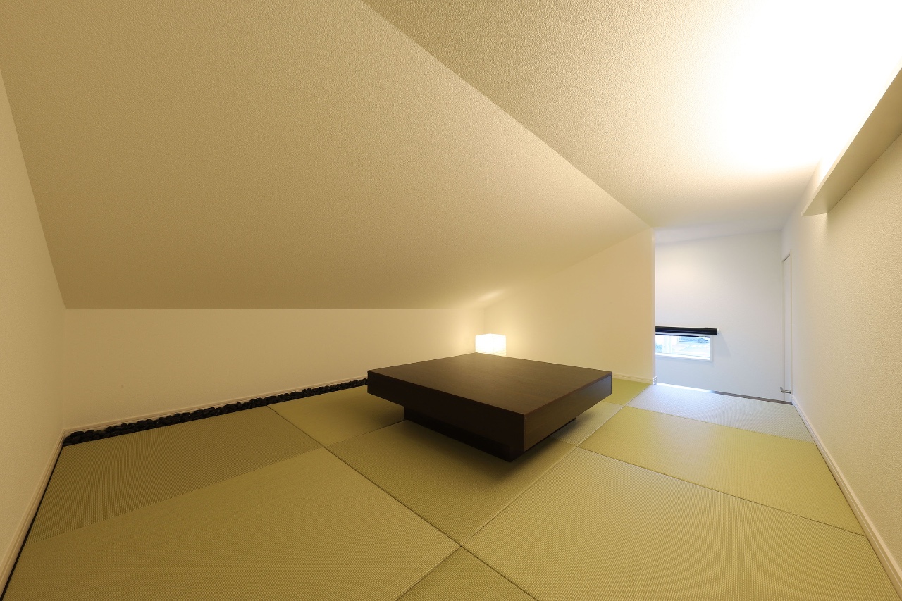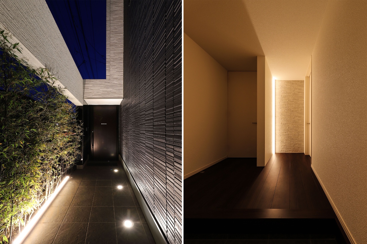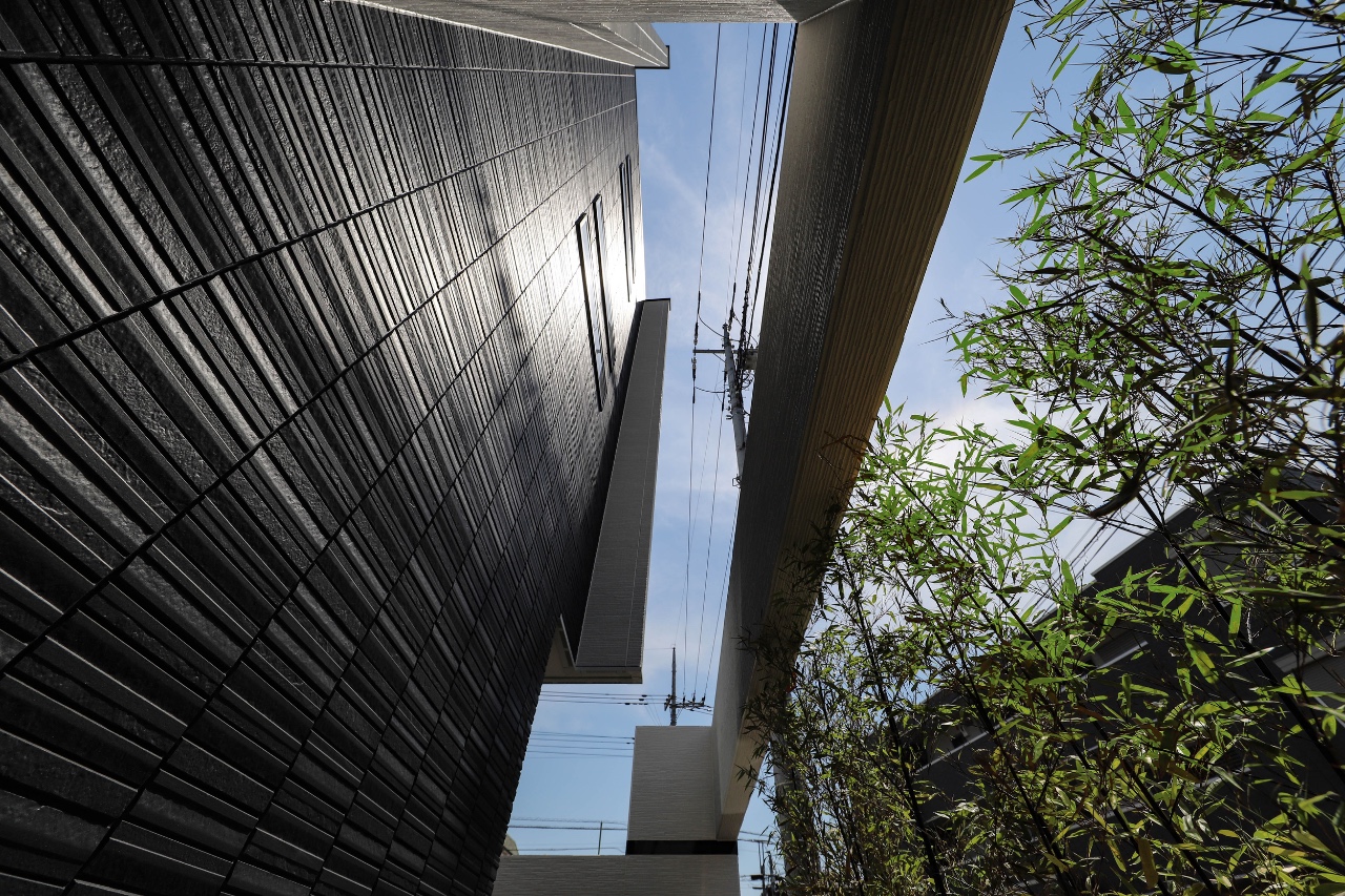 This is a custom home plan for a parent and their three children. The site is located in a quiet suburb and it takes about an hour from central Tokyo by train. It being close to a busy road, the requirement was to design a symbolic and aesthetic exterior appearance while securing privacy. The residential space consisted of three volumes are partitioned off by three walls to bring a comfortable rhythm to the facade. These volumes are enveloped by the boundary walls and a gate placed in periphery of the site which produced a buffer zone full of light and fresh air that loosely link inside and outside the property. By fully taking the sight from the neighbors and the road into account we were able to add variety to the height of the wall for each place so as to bring sunlight into the rooms as much as possible while protecting the familyās visual privacy. We reflected Japanās strict height regulations for buildings in the facade design and achieved a cool and remarkable design, turning adversity into advantage. We planted black bamboo in a row on the approach to the front door and casted light upwards for the purpose of adding the essence of classical Japanese style. This staging created a great ambience. Siding panels textured with deep shadow lines were chosen for the outer walls. The first floor is mainly a large space consisted of living, dining, and kitchen space which is linked to courtyard-style terrace. On the second floor, there are three children’s rooms and a guest room. The guest room is a room with split levels and the upper level space has a tatami-matted floor with refined Japanese modern interior details. The most private area in the house, the master bedroom is placed on the third floor. By making use of the sloped ceiling, its construction of space offers an expressive interior.