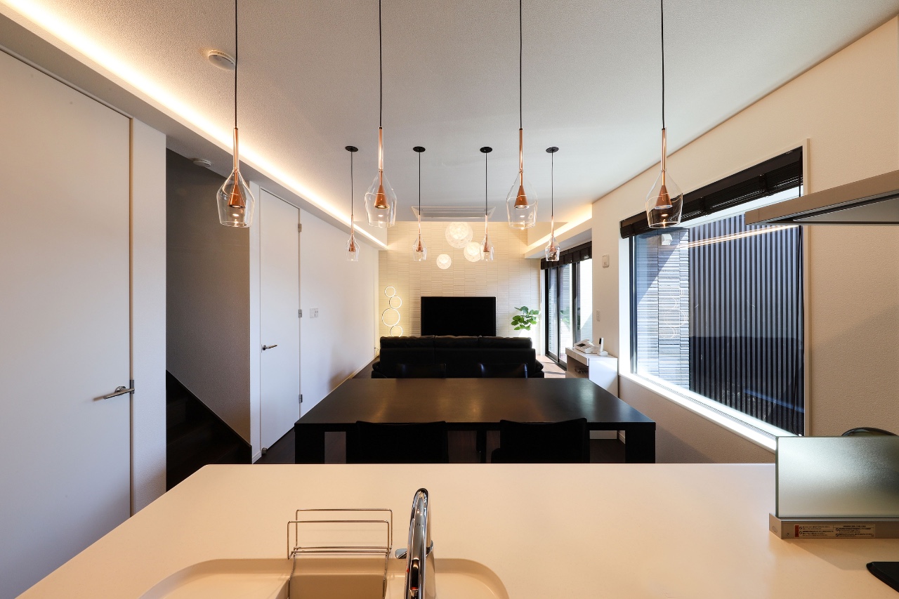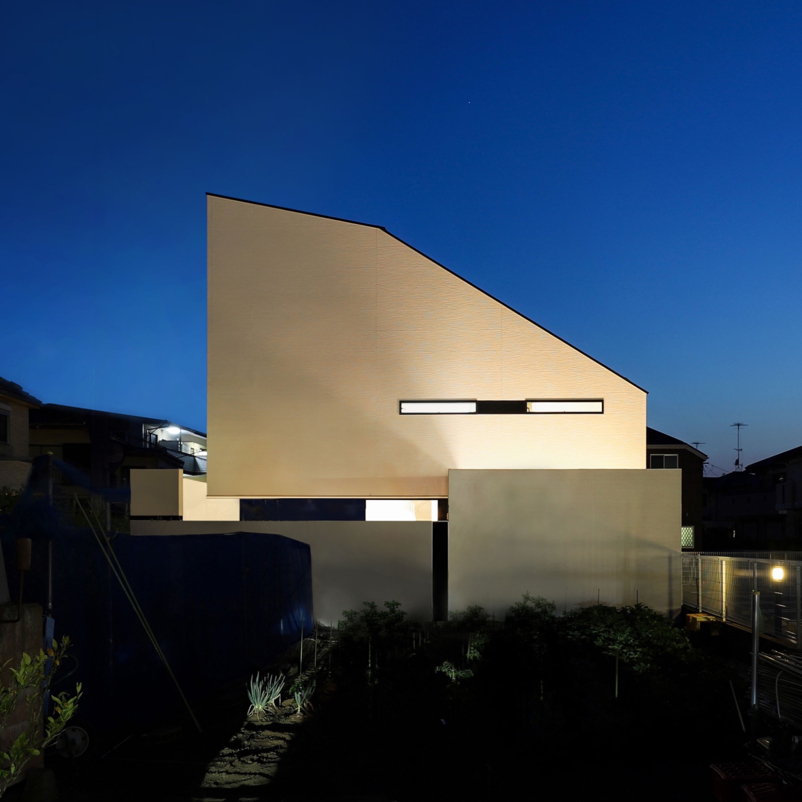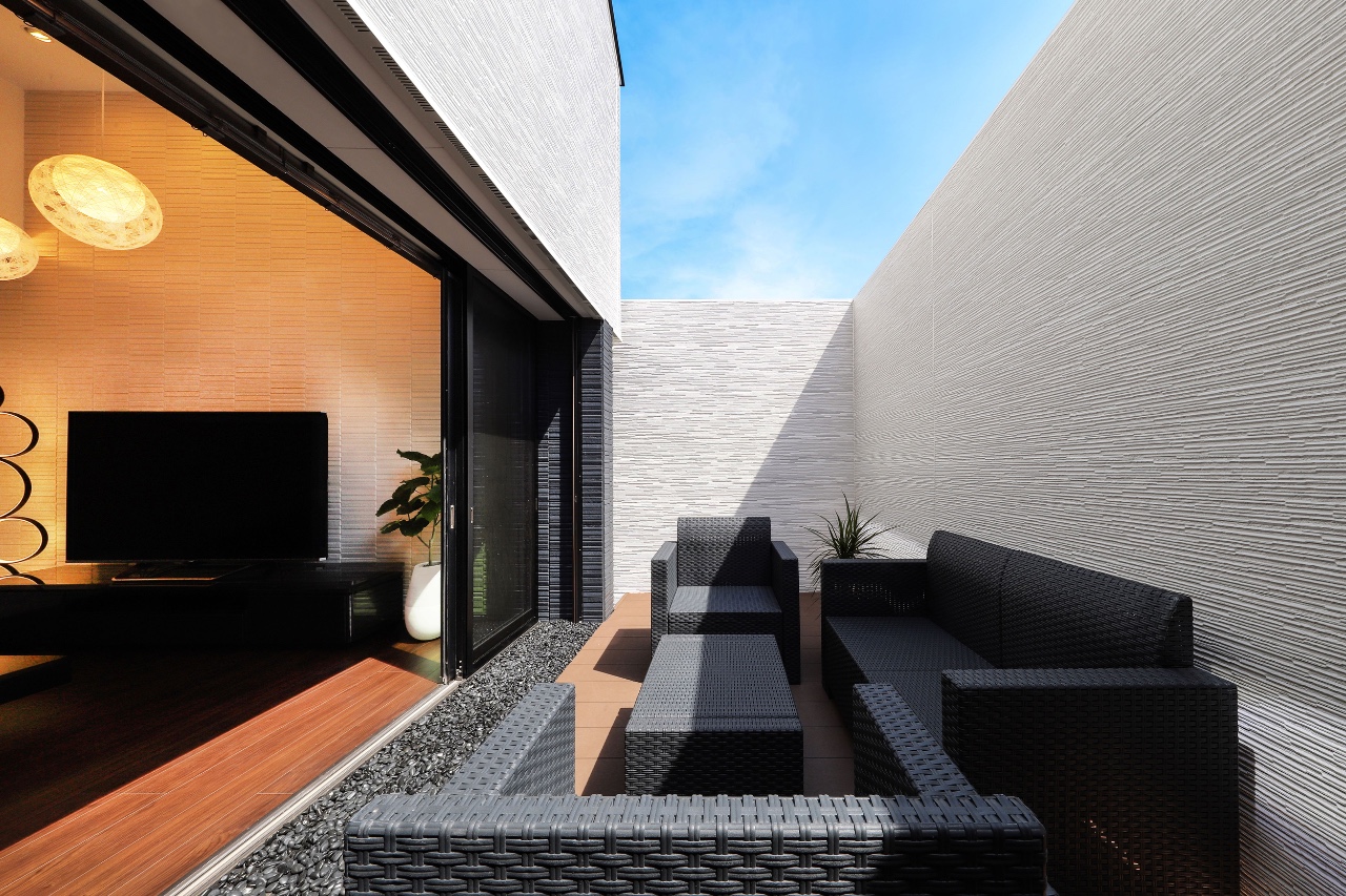 This is a custom home plan for a parent and their three children. The site is located in a quiet suburb and it takes about an hour from central Tokyo by train. It being close to a busy road, the requirement was to design a symbolic and aesthetic exterior appearance while securing privacy. The residential space consisted of three volumes are partitioned off by three walls to bring a comfortable rhythm to the facade. These volumes are enveloped by the boundary walls and a gate placed in periphery of the site which produced a buffer zone full of light and fresh air that loosely link inside and outside the property. By fully taking the sight from the neighbors and the road into account we were able to add variety to the height of the wall for each place so as to bring sunlight into the rooms as much as possible while protecting the familyās visual privacy. We reflected Japanās strict height regulations for buildings in the facade design and achieved a cool and remarkable design, turning adversity into advantage. We planted black bamboo in a row on the approach to the front door and casted light upwards for the purpose of adding the essence of classical Japanese style. This staging created a great ambience. Siding panels textured with deep shadow lines were chosen for the outer walls. The first floor is mainly a large space consisted of living, dining, and kitchen space which is linked to courtyard-style terrace. On the second floor, there are three children’s rooms and a guest room. The guest room is a room with split levels and the upper level space has a tatami-matted floor with refined Japanese modern interior details. The most private area in the house, the master bedroom is placed on the third floor. By making use of the sloped ceiling, its construction of space offers an expressive interior.