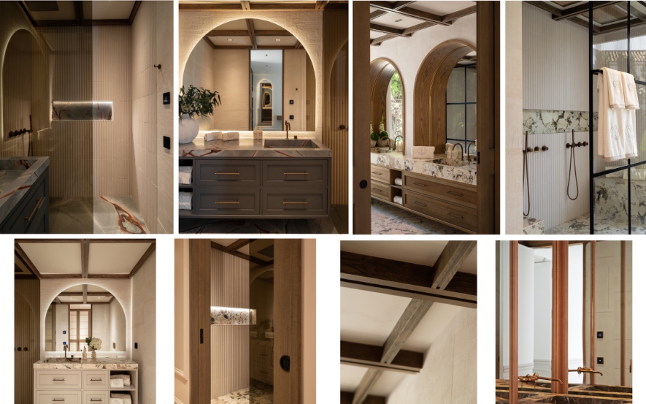 All bedrooms include ensuite bathrooms. The design follows the same line but with different tones and marbles. Floors, countertops, and niches use marble, while walls combine plain and curved tiles. Ceilings have carpentry in oak and are painted in micro-cement to match each bathroomās palette. Each bathroom has a curved mirror and indirect lighting. The master bathroom includes an enclosed toilet, a double shower, and his-and-hers sinks separated by wooden arches.