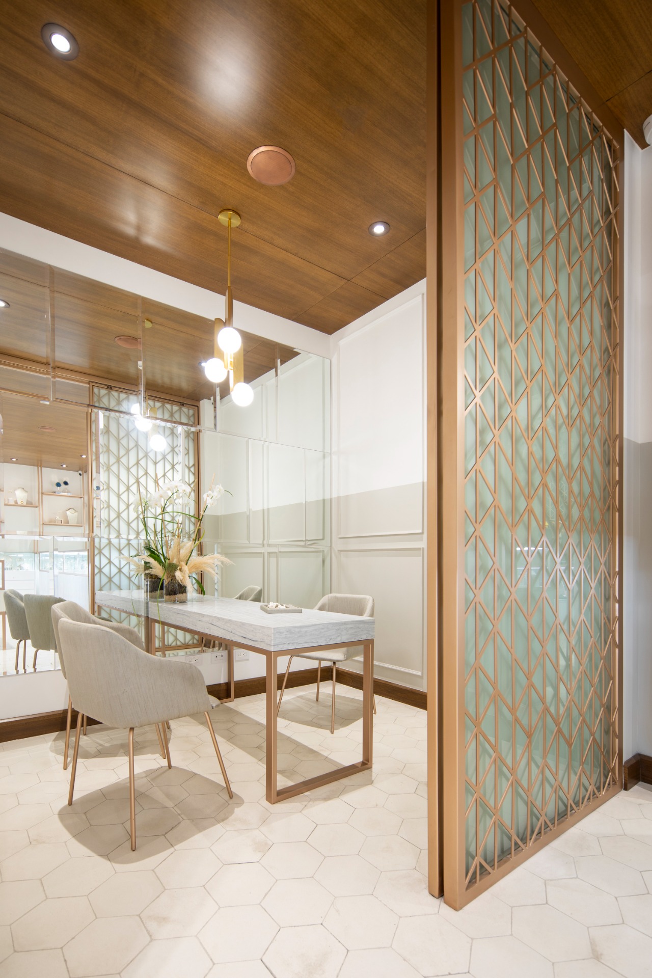 From the façade, a golden geometric screen partially veils the interior, offering a sense of intrigue. Circular display cases, suspended like floating artifacts, present the jewelry as museographic treasures. This initial layer leads into a warm interior where natural light intertwines with focused lighting, illuminating each showcase like a small theatrical scene. At the heart of the space floats a sculptural chandelier made of natural feathers—crafted by local artists—evoking a botanical cloud and anchoring the experience in a vision of reimagined nature.