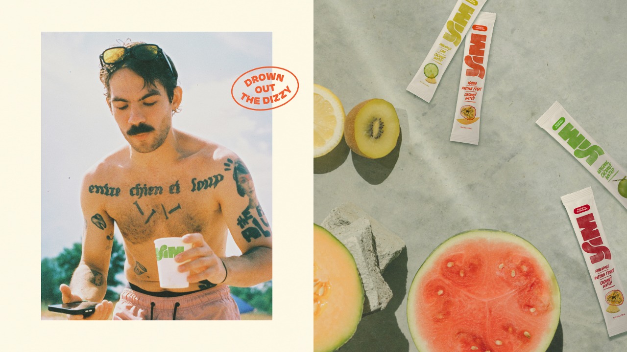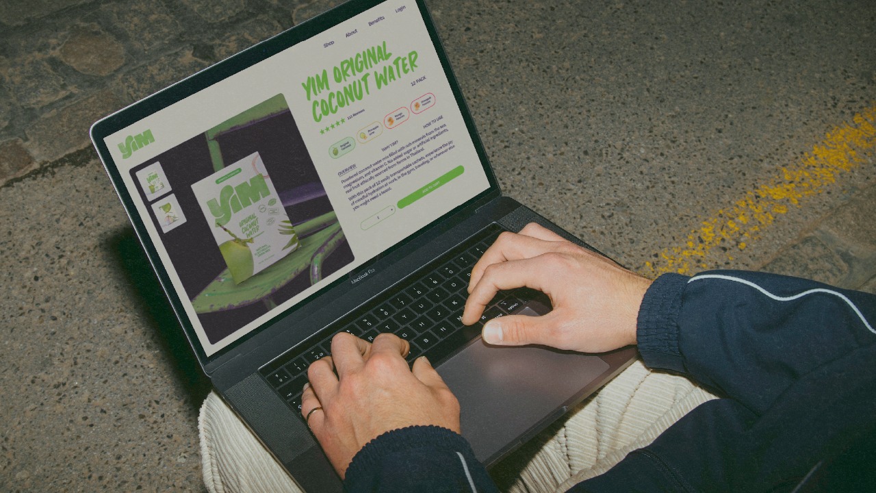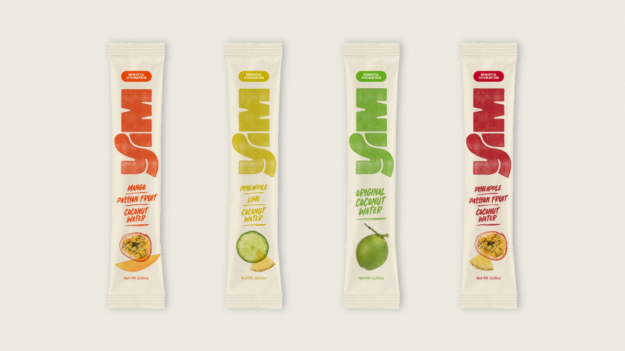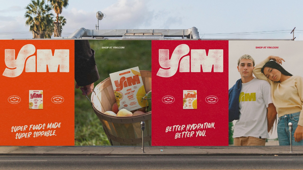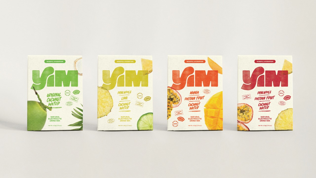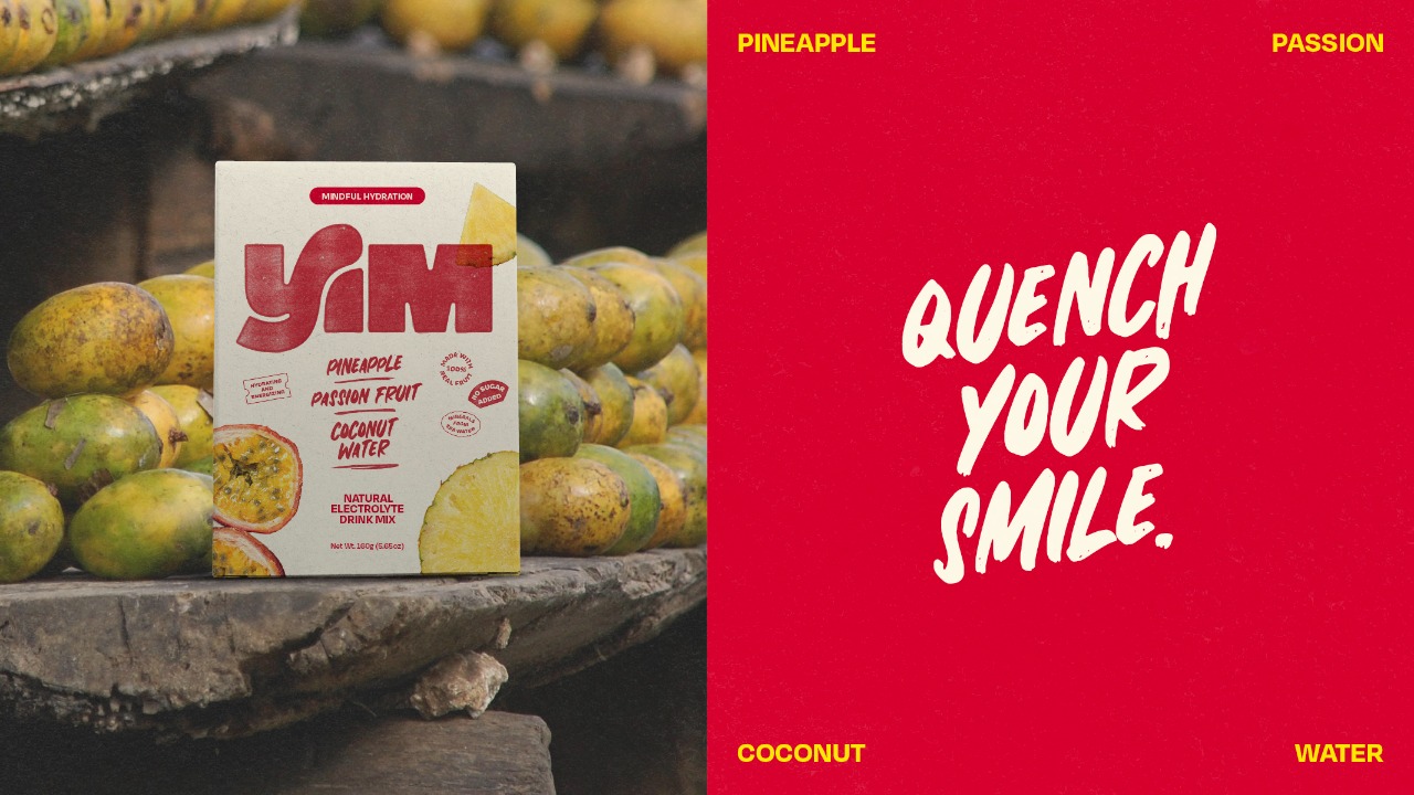 Yim’s new brand identity is as real as its ingredients. Authenticity serves as the foundation for all the visual elements. Lo-fi, unposed, and spontaneous photography portrays the clarity that emerges from overcoming the mental fog and emotional lows caused by dehydration. Yim’s headline font, inspired by sign-painting typography from street markets, honors the roots of the brand’s high-quality ingredients. A subtle water droplet is hidden in the Yim logo. The “Y” extends into a teardrop shape to form the tittle of the “i,” reinforcing the brand’s focus on hydration. Another subtle detail in the new logo is a cheeky smirk that is incorporated into the tail of the “Y,” which acts as a nod to the Thai meaning of Yim, which is “smile.” The color palette draws from the bold, natural hues of fruit, from luscious mangoes and pineapples to juicy limes and passion fruit. Since coconut is the core ingredient for all Yim products, the packaging is grounded in a coconut cream base color, with each flavor accented by a corresponding foreground color.